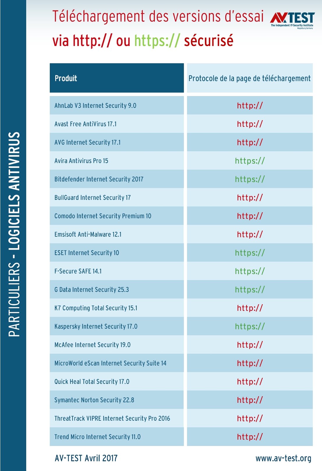 Tandis qu’il n’existe quasiment pas de téléchargements directs pour les solutions professionnelles, presque tous les fabricants proposent leurs versions d’essai aux particuliers. Ce contrôle rapide des téléchargements fait l'effet d'une douche froide : 13 des 19 fabricants proposent leurs versions d’essai avec un protocole HTPP non sécurisé. Seuls Avira, Bitdefender, ESET, F-Secure, G Data et Kaspersky Lab ont recours au protocole sécurisé HTTPS.