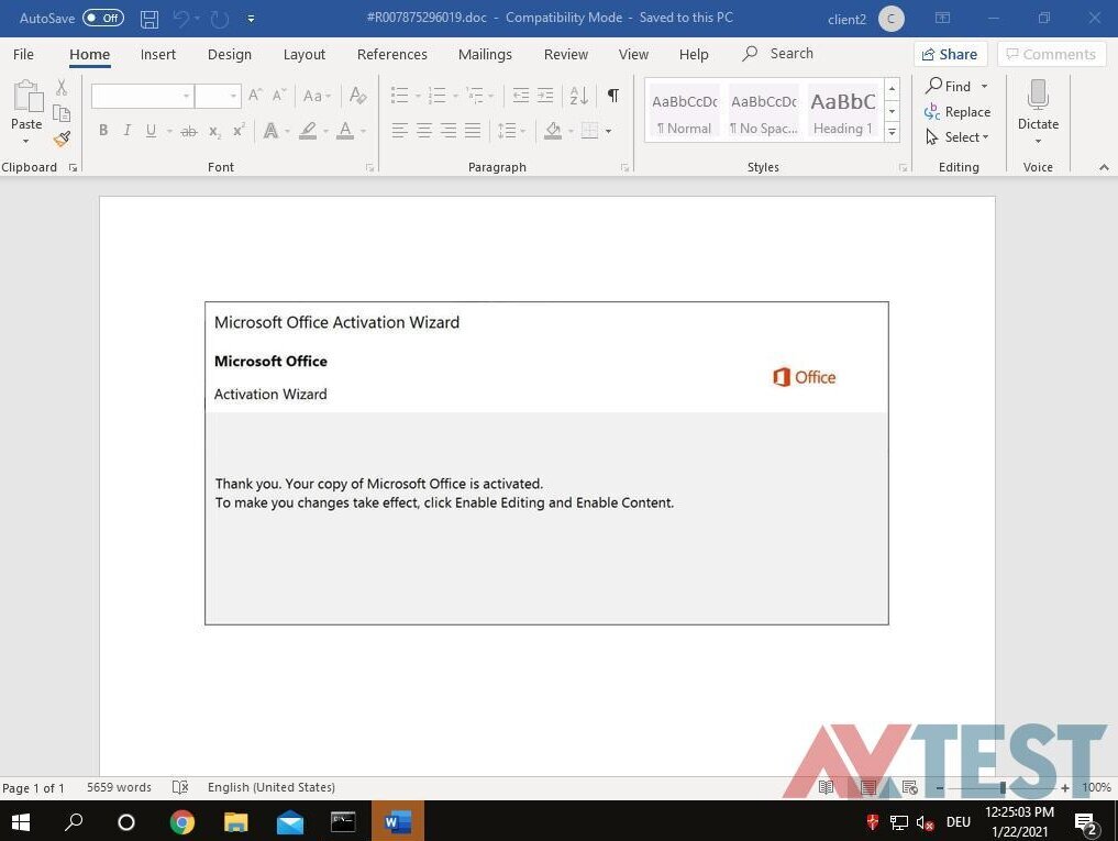 Une attaque se déroule à peu près de la manière suivante : tout d’abord, le destinataire reçoit un courriel très bien falsifié au nom d’un client connu ou par exemple d’un opérateur de télécommunication. Le courriel contient soit un fichier attaché au format DOC ou un lien pointant vers un fichier dangereux. Dans le courriel, l’utilisateur est informé qu’il doit absolument autoriser les contenus actifs dans le fichier DOC (macros). Ce code est si petit que son analyse représente un véritable défi pour les suites de protection.