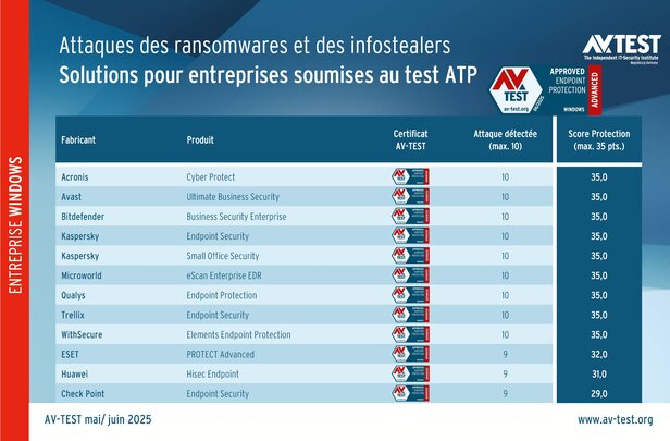 20 suites de protection des systèmes Windows ont participé au dernier test ATP. 8 suites protègent les PC de particuliers, les 12 autres solutions défendent les points de terminaison Windows en entreprise. Les produits ont été testés en mai et juin 2025 sur Windows 10, le système d’exploitation qui continue d'être utilisé sur la plupart des PC dans les entreprises et chez les particuliers. Les fournisseurs de logiciels pour particuliers suivants ont participé au test : Avast, AVG, Bitdefender, ESET, K7 Computing, Kaspersky, McAfee et Norton. Du côté des solutions pour entreprises, ce sont les fournisseurs suivants qui ont été testés : Acronis, Avast, Bitdefender, Check Point, ESET, Huawei, Kaspersky (avec 2 versions), Microworld, Qualys, Trellix et WithSecure.