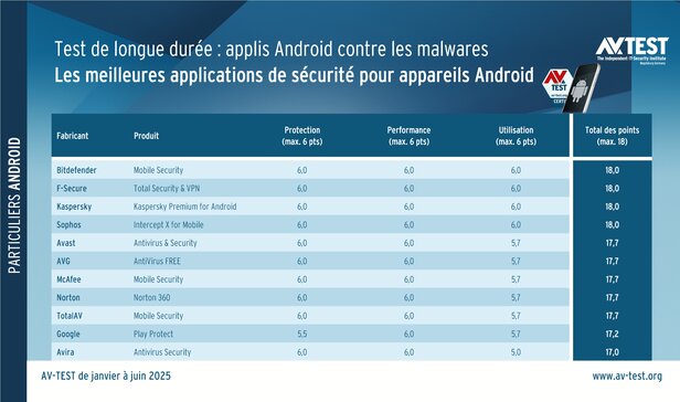 Les 11 applications de sécurité pour Android des fabricants suivants ont été soumises au test : Avast, AVG, Avira, Bitdefender, F-Secure, Kaspersky, McAfee, Norton, Sophos et TotalAV. La protection de Google Play Protect installé sur les systèmes Android avec Play Store a également participé au test.