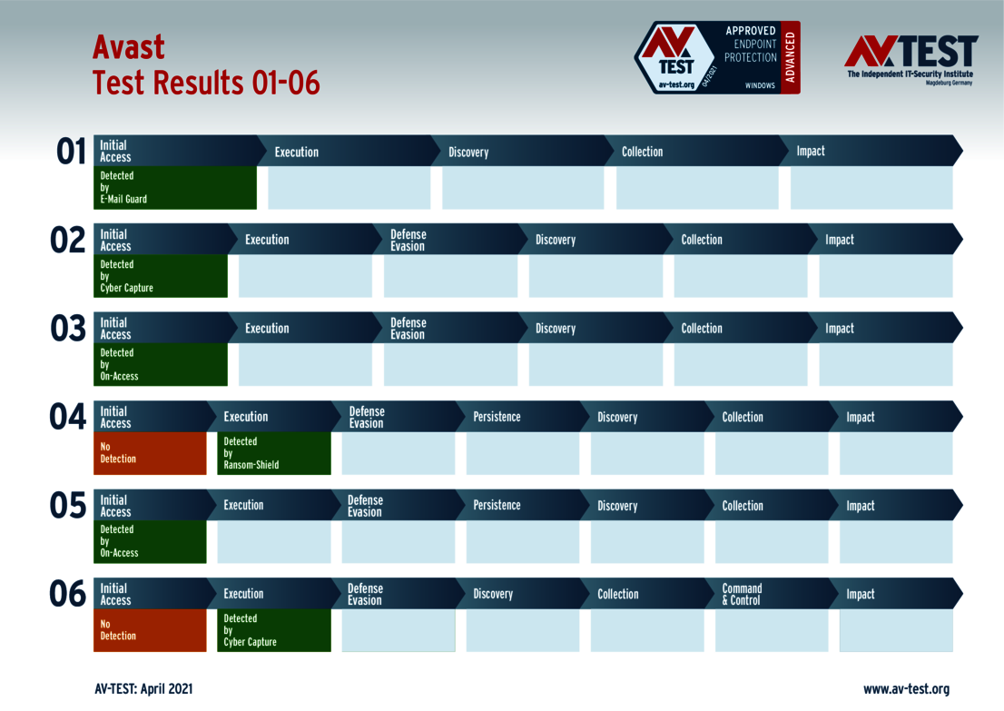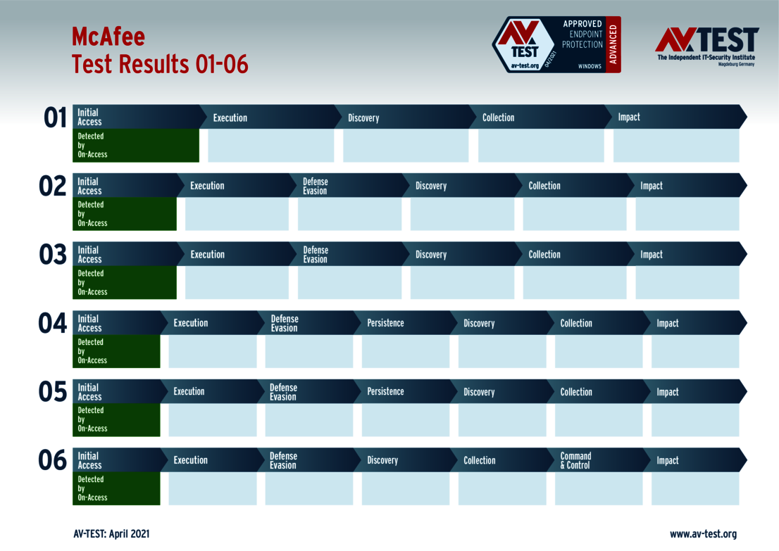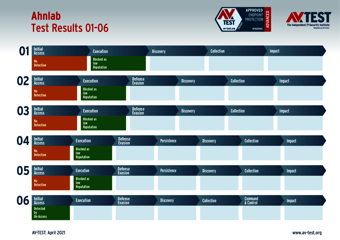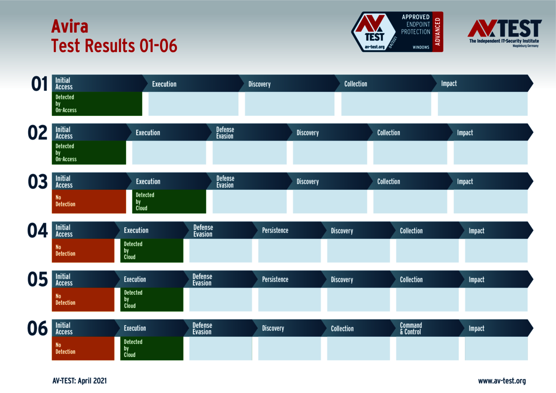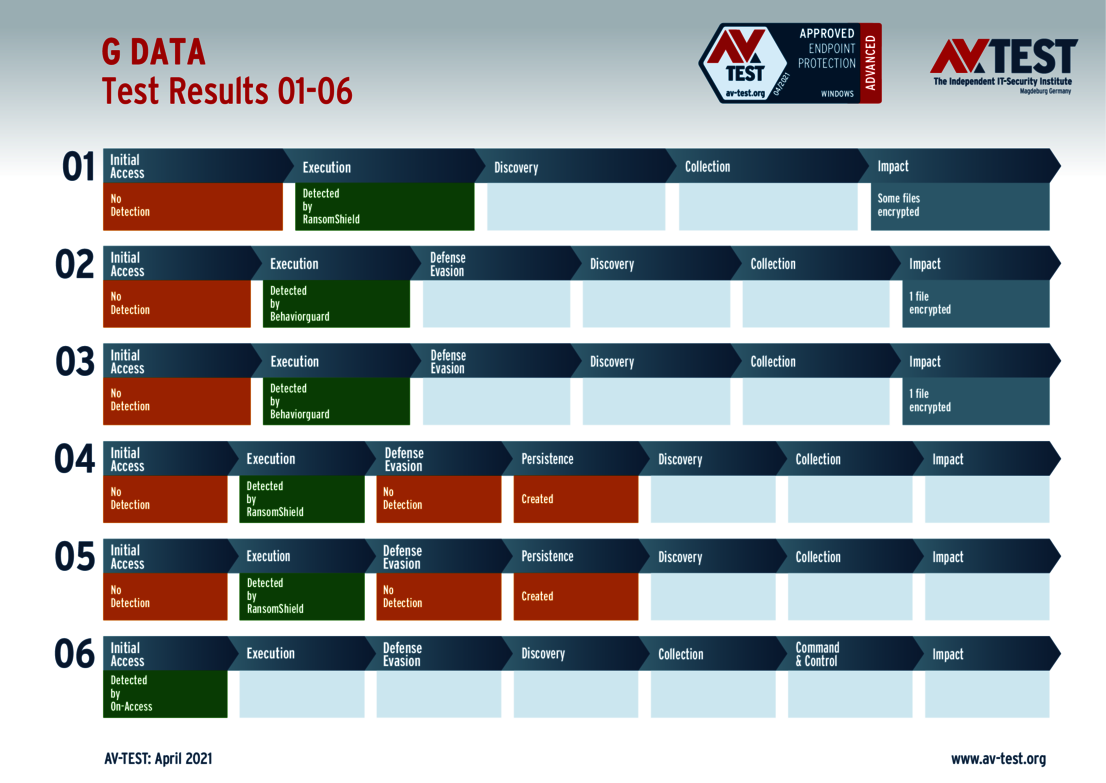 Au cours de la première série de tests approfondis, l’institut AV-TEST a donc analysé les performances de détection et de défense de 6 produits EPP (Endpoint Protection Platform) et 3 EDR (Endpoint Detection and Response) contre les attaques APT avec des rançongiciels utilisant la technique « Data Encrypted for Impact » (MITRE ID: T1486). Ce sont les solutions EPP des fabricants AhnLab, Avast, Avira, Bitdefender, G Data et McAfee ainsi que les systèmes EDR de Bitdefender, McAfee et VMware qui ont été mises au banc d’essai. Tous les onze tests de la série ont été effectués sur la variante du système d’exploitation Windows 10 Professional (64 Bit) courant dans les entreprises. Les simulations d’attaque se sont déroulées en reproduisant les tactiques et les techniques de la MITRE ATT&CK Matrix for Enterprise.