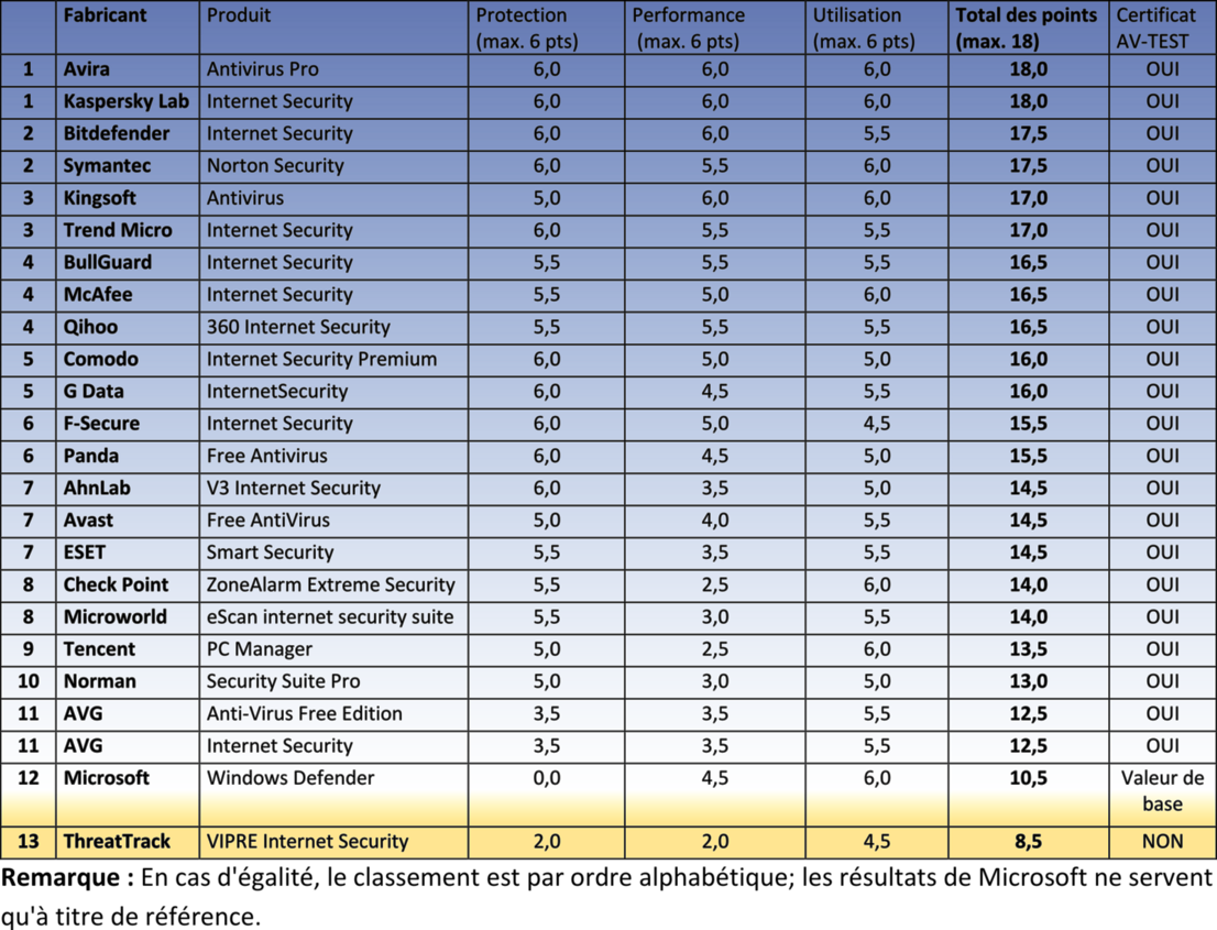 Lors de ce test avec la plateforme Windows 8.1, 2 produits ont déjà pu obtenir la note maximale de 18/18 : Avira Antivirus Pro et la suite de sécurité Internet de Kaspersky Lab. Les solutions de Bitdefender, Symantec, Kingsoft et Trend Micro suivent de près avec 17,5 et 17/18.