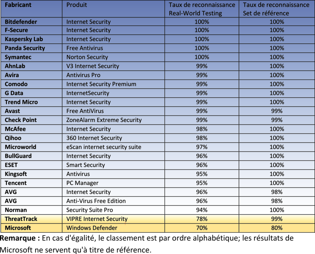 La protection de base de Windows appelée Windows Defenders qui a été testée à titre comparatif n'atteint que 10,5/18. Sa très faible performance en matière de reconnaissance de programmes malveillants lui a fait perdre bien des points.