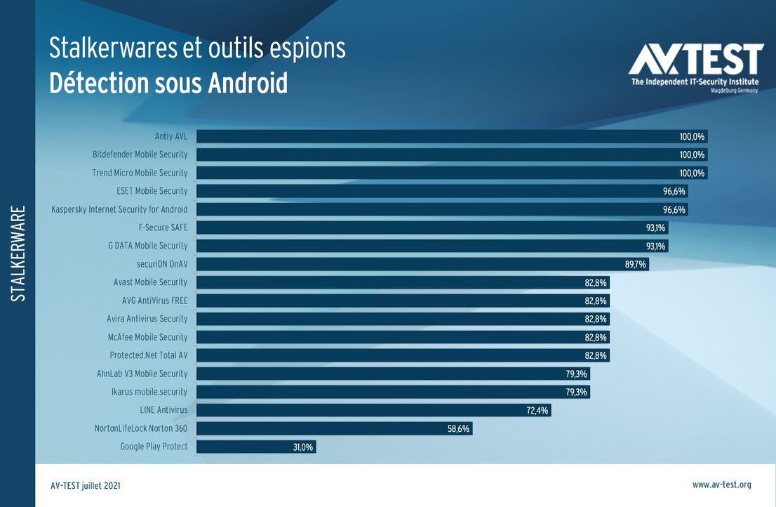 Le reste du classement démasque les logiciels espions à un taux se situant entre 89,7 pour cent et 58,6 pour cent. Google Play Protect, l’application de sécurité interne d’Android, ne signale que 31 pour cent des applications en réalité interdites.