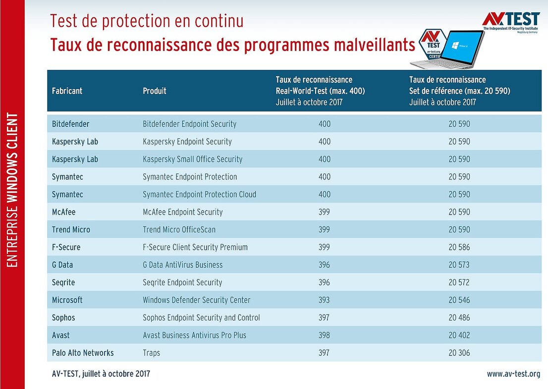 Le test incluait les suites de sécurité pour entreprises d’Avast, Bitdefender, F-Secure, G Data, Kaspersky Lab (Endpoint et Small Office Security), McAfee, Microsoft, Palo Alto Networks, Seqrite, Sophos, Symantec (Endpoint Protection et Endpoint Protection Cloud) et Trend Micro. Les essais se sont déroulés de juillet à octobre 2017. Chaque produit a été soumis mensuellement à une série de tests complète avec un test en conditions réelles (real-world test) et un test avec le kit de référence d’AV-TEST. Ces kits comprenaient en tout 400 nouveaux programmes malveillants encore inconnus et 20 590 exemplaires de malwares déjà connus.
