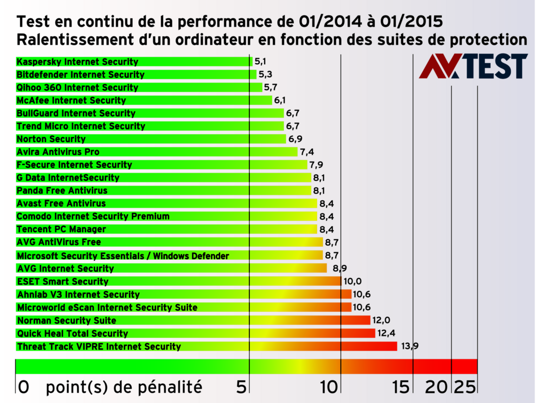 Le résultat montre qu'un bon logiciel de protection ne freine pas considérablement un ordinateur Windows. Comme pour tous les logiciels en cours d'exécution, les antivirus nécessitent quelques ressources du système ce qui ralentit par principe l'ordinateur. Les produits de Kaspersky, Bitdefender et Qihoo 360 ont fait preuve de la plus faible influence sur le système durant ce test continu, et ce, tout en offrant une bonne protection comme le prouvent les derniers tests de protection (« Les meilleurs logiciels antivirus pour Windows - Particuliers »).