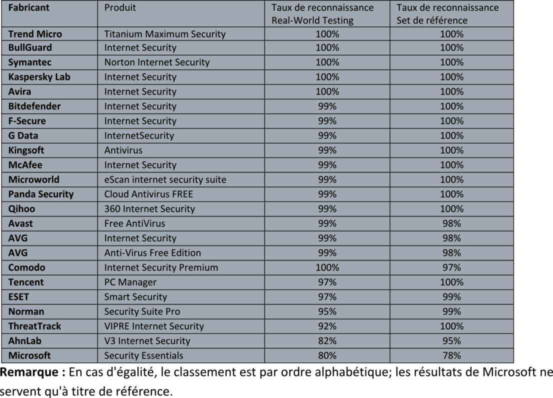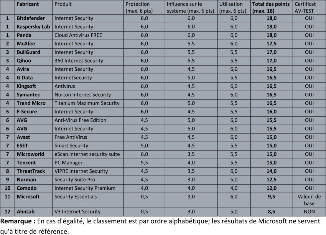 Toutes les solutions, que ce soit pour le secteur privé ou professionnel, ont obtenu de bons résultats lors de ces tests, lesquels leur ont valu des notes entre 5 et 6/6. Seul le produit de Comodo ne mérite que 4/6.