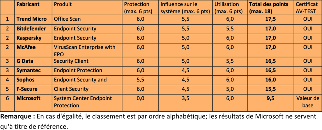 Les 9 solutions professionnelles testées ont également atteint un bon résultat global. Trend Micro recueille la note de 17,5/18, suivi par Bitdefender, Kaspersky Lab et McAfee avec chacun 17/18. Les autres suites obtiennent également de bonnes notes situées entre 15,5 et 16,5/18.