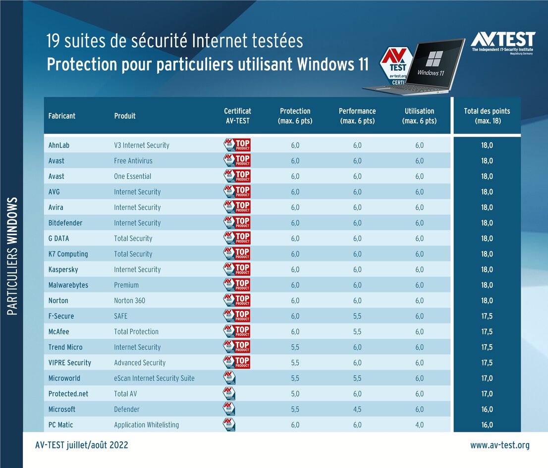 Les suites d’AhnLab, Avast (Free), Avast (One Essential), AVG, Avira, Bitdefender, G DATA, K7 Computing, Kaspersky, Malwarebytes et Norton ont terminé le test sous Windows 11 en obtenant la note maximale de 18 points. Elles sont suivies de près par les suites de sécurité de F-Secure, McAfee, Trend Micro et VIPRE Security qui totalisent 17,5 points.