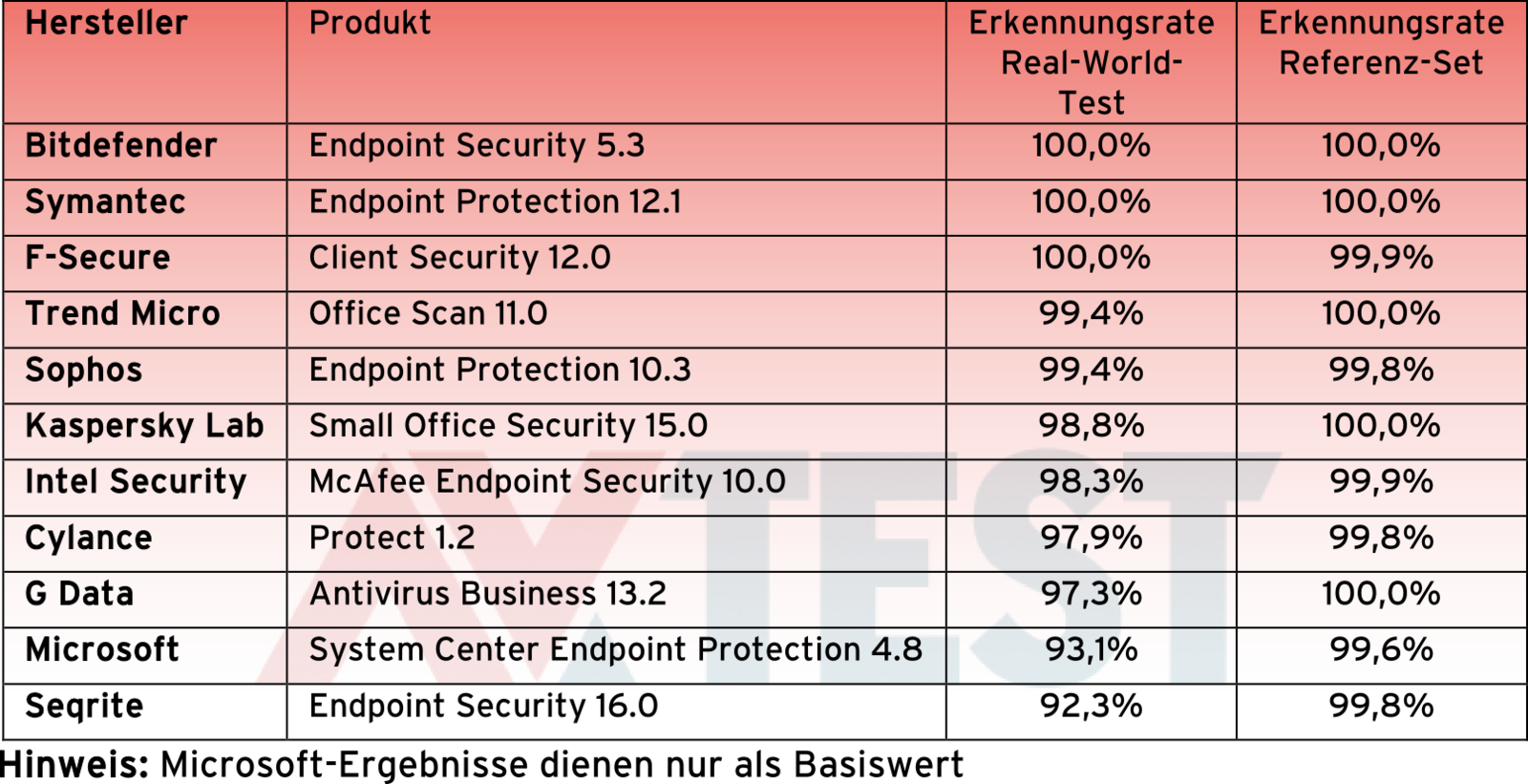 Das Ergebnis des mitgetesteten Security-Moduls von Microsoft, das System Center Endpoint Protection, dient dem Labor als Basiswert zum Vergleich. Die Messlatte lag somit bei 15 Punkten, welche aber von Intel Security, Sophos, F-Secure und G Data überschritten wurde. Lediglich die Produkte von Cylance und Seqrite lagen mit 13,5 und 13 Punkten darunter.