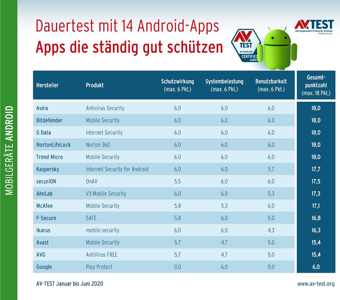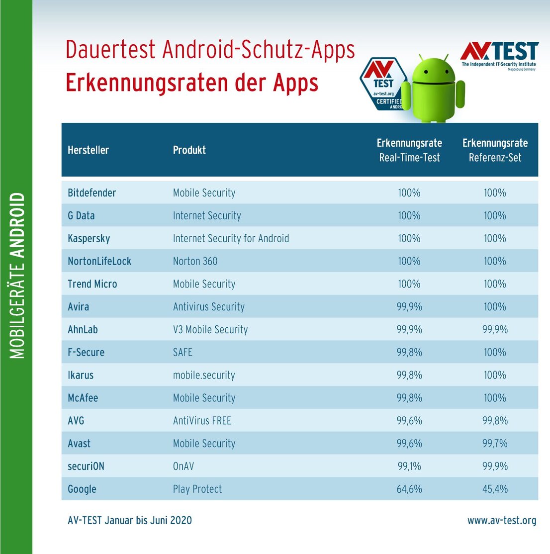Im großen Test von Januar bis Juni 2020 prüfte das Labor 14 Android-Schutz-Apps unter Android 8.0 (Oreo). Im Test finden sich die Apps von AhnLab, Avast, AVG, Avira, Bitdefender, F-Secure, G Data, Ikarus, Kaspersky, McAfee, NortonLifeLock, securiON und Trend Micro. Im Vergleich dazu wurde auch Google Play Protect mitgeprüft, da es auf jedem Android-Gerät mit Googles Play Store automatisch ausgeführt wird.