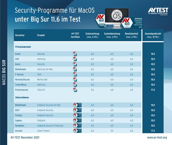 Für mehr Schutz am Mac hat das Labor von AV-TEST insgesamt 14 Produkte untersucht. Die 8 Schutzpakete für private Nutzer kommen von Avast, AVG, Avira, Bitdefender, F-Secure, NortonLifeLock, Trend Micro und Protected.net. Für Macs in Unternehmen nahm sich das Labor 6 weitere Schutzlösungen vor: Acronis, Bitdefender, ESET, FireEye, Sophos und Symantec. Alle Produkte wurden im November und Dezember 2021 in den Kategorien Schutzwirkung, Systemlast und Benutzbarkeit untersucht. Als Testplattform dient MacOS Big Sur 11.6.
