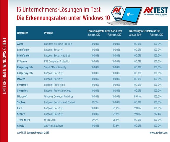 Es hat lange gedauert, aber nun ist Windows 10 definitiv auch in den Unternehmen angekommen. Diverse Statistikportale sehen die Nutzung von Windows 10 bei etwa zwei Dritteln der Firmen-PCs und die Zahl steigt weiter. Die Entwicklung wird natürlich auch mit dem Support-Ende für Windows 7 in 2020 zusammenhängen. Das Labor von AV-TEST hat im Januar und Februar jeweils 15 Security-Lösungen für Unternehmen auf ihre Schutzwirkung, Geschwindigkeit und Benutzbarkeit am Windows-10-Client geprüft. Für jede Lösung gab es pro Testabschnitt bis zu 6 Punkte zu erreichen, insgesamt also 18.
