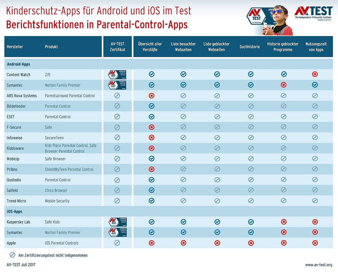 Geprüft wurden 13 Apps für Android, 2 Apps für iOS und die interne Kinderschutz-App von iOS. Die Android-Beschützer Norton Family Premier von Symantec und Zift von Content Watch stellten sich einem ausführlichen Zertifikatstest. Sie mussten daher viel mehr Prüfungen und Filterungen bestehen als die anderen Apps.