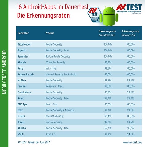 Laut Statistiken gibt es weltweit über 2,5 Milliarden Android-Geräte. Die gilt es gegen mehr als 20 Millionen Schädlinge zu schützen. Welche Android-Apps das am besten können, hat das Labor in einem Dauertest von Januar bis Juni 2017 geprüft und kann diverse Apps empfehlen.