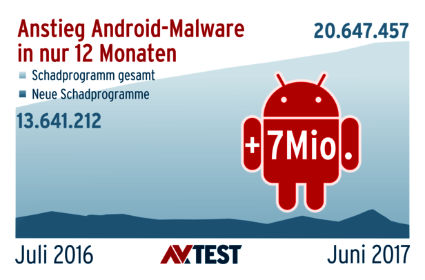 Die Menge an weltweit arbeitenden Android-Geräten ist schon beeindruckend: 2,5 Milliarden Geräte ist der statistisch erfasste Stand im März 2017. Genauso beängstigend ist auch der aktuelle Stand an registrierten Schädlingen in der AV-TEST Datenbank: über 20 Millionen. Allein der Zuwachs von Juli 2016 zu Juni 2017 liegt bei 7 Millionen Schädlingen. Wer jetzt eine Android-Schutz-App immer noch für unnötig hält, der ist nach vielen Expertenmeinungen selbst schuld.