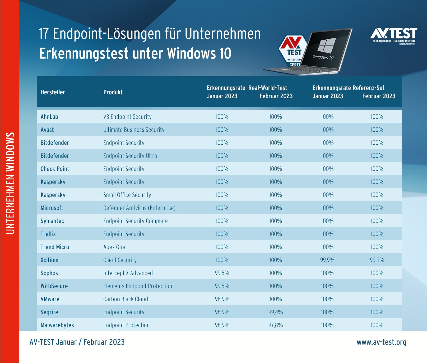 Im Labortest von Januar und Februar 2023 unter Windows 10 finden sich die Unternehmensprodukte folgender Hersteller: AhnLab, Avast, Bitdefender (Version Endpoint und Ultra), Check Point, Kaspersky (Version Endpoint und Small Office), Malwarebytes, Microsoft, Seqrite, Sophos, Symantec, Trellix, Trend Micro, VMware, WithSecure und Xcitium.