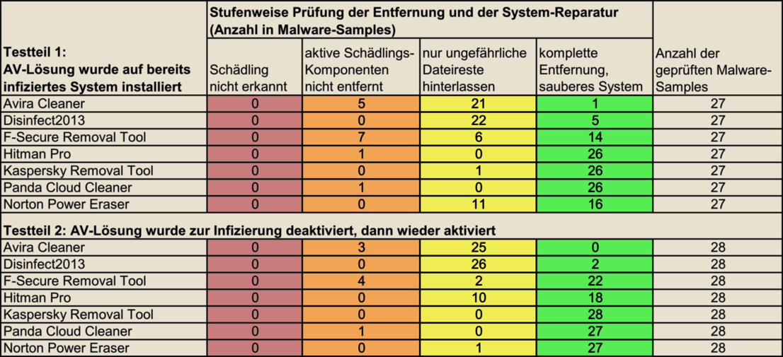 Von den 7 Reinigungs-Tools scheiterten auch mehr als die Hälfte der Teilnehmer an dieser wichtigen Aufgabe: Hitman Pro, Panda Cloud Cleaner, Avira Cleaner und das F-Secure Removal Tool konnten 1 bis 11 aktive Komponenten nicht entfernen.