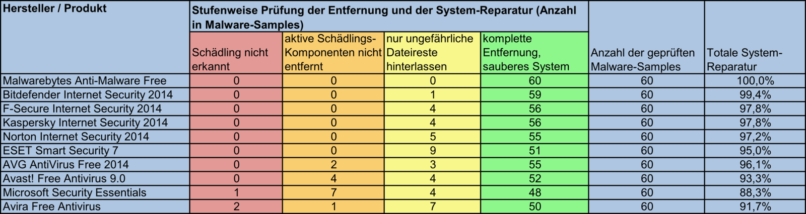 Die meisten Antivirenlösungen schnitten im Reparaturtest sehr gut ab. Einige hinterließen zwar etwas digitalen Müll, aber nichts Gefährliches (AV-TEST Dauertest von 9/13 bis 6/14).