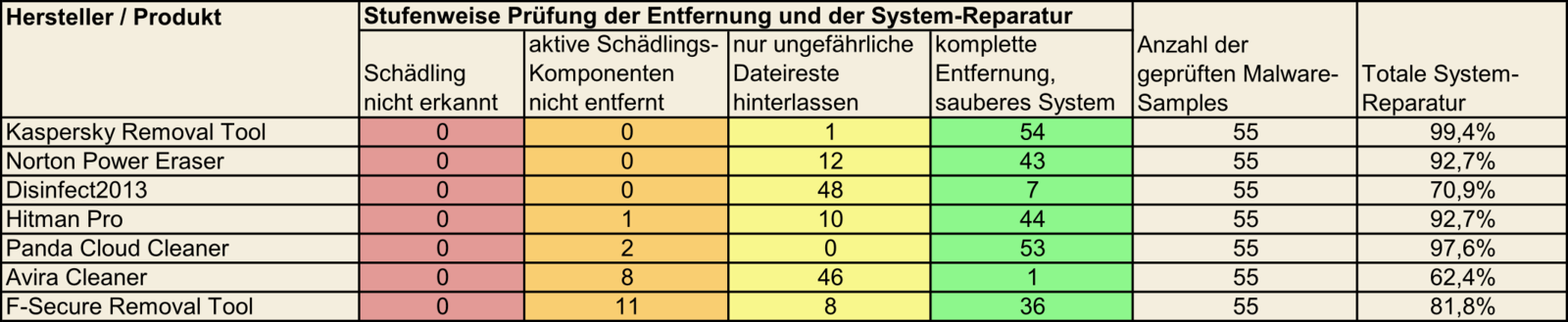 Bei den Reinigungs-Tools konnte keines der Tools alle 55 verseuchten Testsysteme komplett gereinigt übergeben. Nur das Kaspersky Removal Tool zeigte eine Top-Leistung. Es verpasste mit nur einer übersehenen, aber ungefährlichen Restdatei die fehlerfreie Systemübergabe.