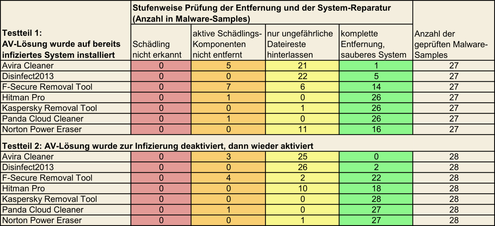 Von den 7 Reinigungs-Tools scheiterten auch mehr als die Hälfte der Teilnehmer an dieser wichtigen Aufgabe: Hitman Pro, Panda Cloud Cleaner, Avira Cleaner und das F-Secure Removal Tool konnten 1 bis 11 aktive Komponenten nicht entfernen.