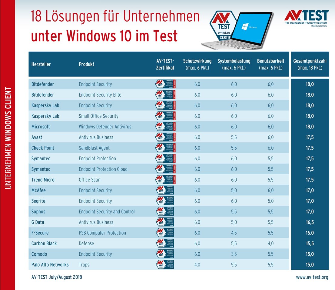 Alles Tests fanden in der Zeit von Juli bis August 2018 statt. Jedes Produkt musste in dieser Zeitspanne alle Prüfungen doppelt durchlaufen. Trotz der hohen Hürden in den Checks kann das Labor für viele Produkte nicht nur ein Zertifikat für deren Sicherheit vergeben, sondern auch die Auszeichnung TOP-PRODUCT. Dieses Prädikat erhalten nur Produkte mit einer Gesamtwertung von 18 bzw. 17,5 Punkten. Jeweils beide Produkte von Bitdefender und Kaspersky Lab errangen diese Anerkennung, aber auch Microsoft, Avast, Check Point, Trend Micro und Symantec mit zwei Lösungen.