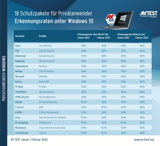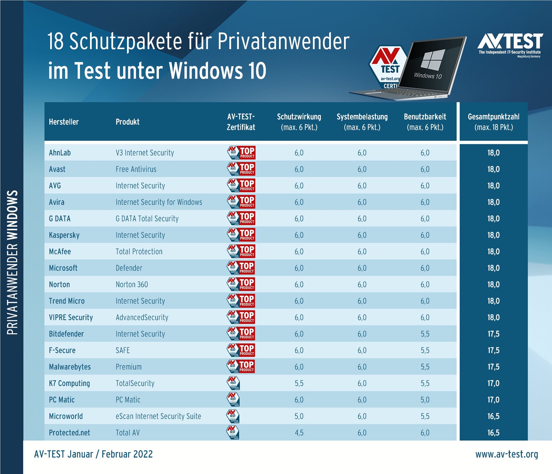 Der Test im Januar und Februar 2022 von Schutzprogrammen für Windows 10 verläuft für viele Hersteller von sehr gut bis perfekt. Insgesamt 11 von 18 Schutzpaketen erreichen den besten Punktewert von 18. Die Produkte kommen von AhnLab, Avast, AVG, Avira, G DATA, Kaspersky, McAfee, Microsoft, Norton, Trend Micro und VIPRE Security. Drei weitere Pakete erhalten noch sehr gute 17,5 Punkte: Bitdefender, F-Secure und Malwarebytes. Alle diese 14 Produkte erzielen neben einem Sicherheitszertifikat die besondere Auszeichnung TOP-PRODUCT.