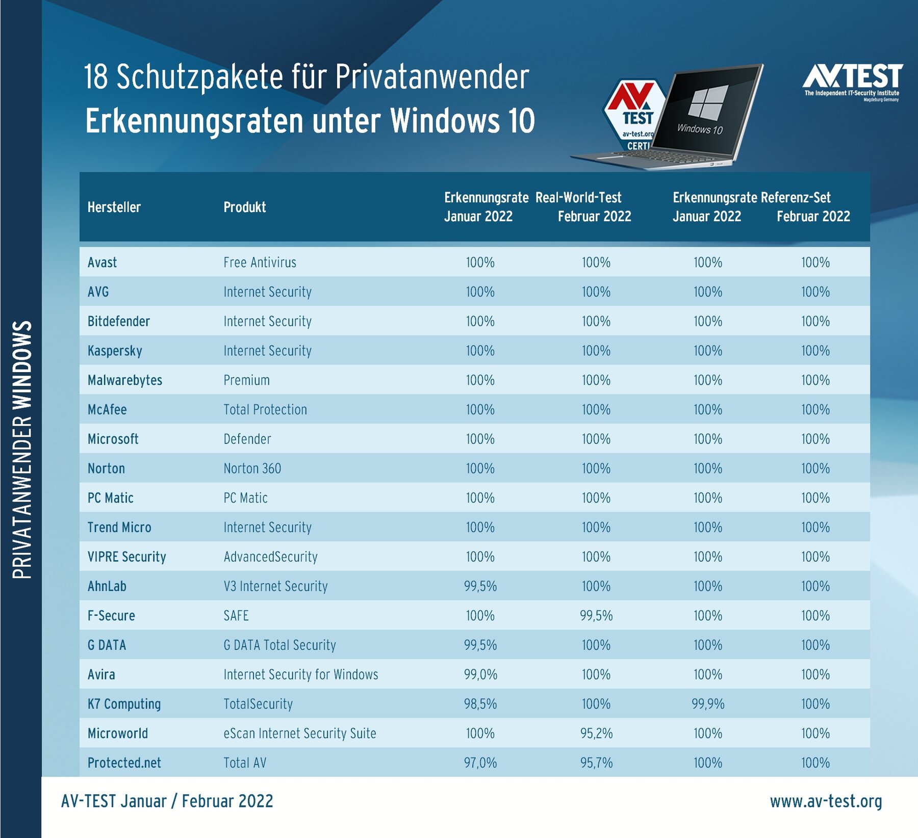 Das Labor von AV-TEST hat in diesem Test 18 Schutzpakete auf ihre Schutzwirkung, ihre Systembelastung und ihre Benutzbarkeit überprüft. Der letzte Punkt steht dabei primär für den Test auf Fehlalarme. Jedes Produkt wird in zwei aufeinander folgenden Monaten geprüft und die Ergebnisse addiert. Der Test mit den 18 Schutzprodukten fand im Januar und Februar 2022 unter Windows 10 im Labor statt. Mit im Test sind die Schutzpakete und Internet Security Suiten von AhnLab, Avast, AVG, Avira, Bitdefender, F-Secure, G DATA, K7 Computing, Kaspersky, Malwarebytes, McAfee, Microsoft, Microworld, Norton, PC Matic, Protected.net, Trend Micro und VIPRE Security.