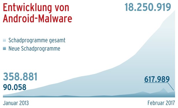 Wer die aktuelle Statistik über Android-Schädlinge sieht, der kontrolliert sofort seine Schutz-App auf dem mobilen Gerät: es sind bereits mehr als 18 Millionen Schädlinge registriert. Und es sieht nicht danach aus, als würde das Wachstum in nächster Zeit stagnieren. Pro Monat kommen in etwa 600.000 neue Schädlinge hinzu – inzwischen auch Ransomware. Diese Schädlinge verschlüsseln die Daten des Geräts und geben sie nur gegen eine Zahlung wieder frei.