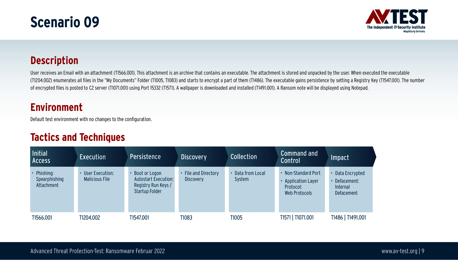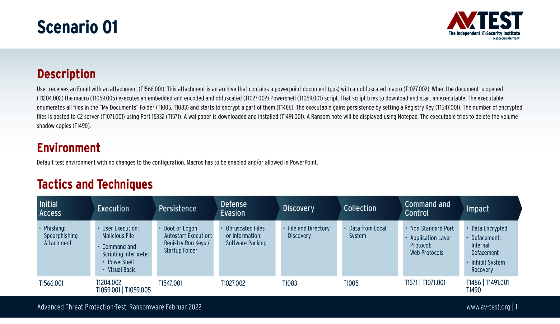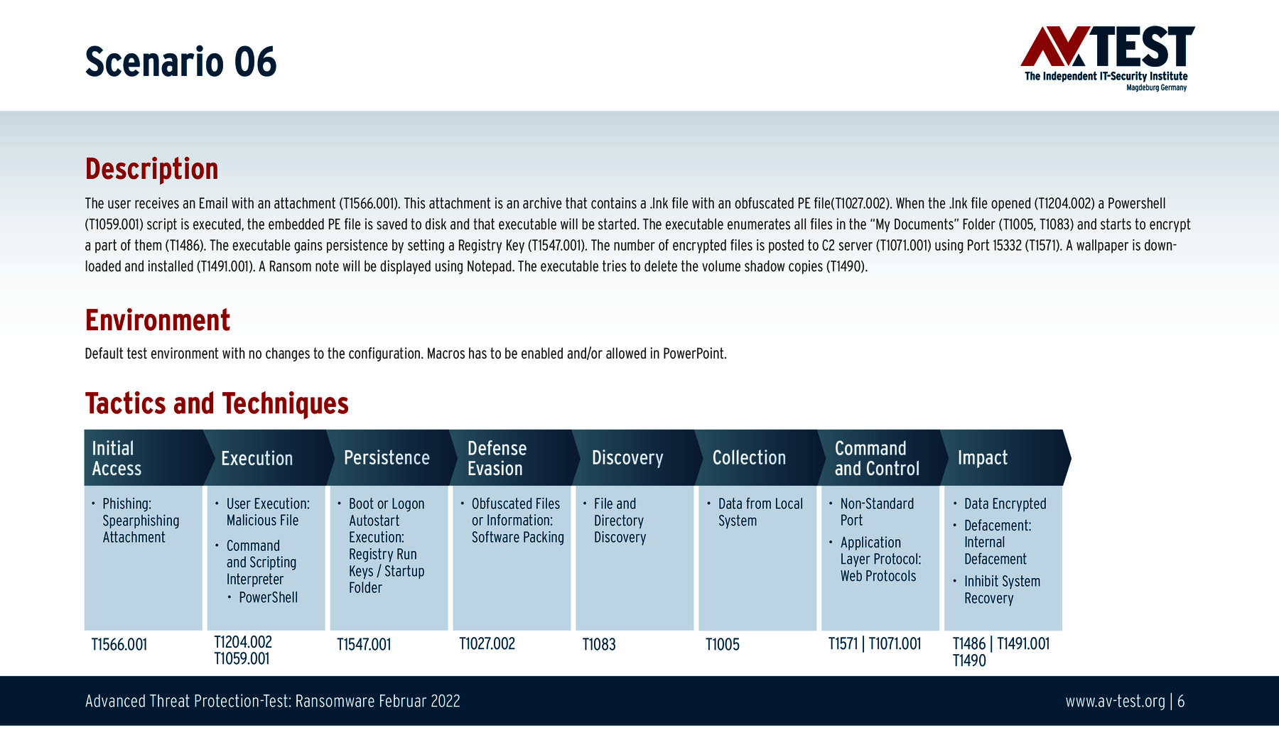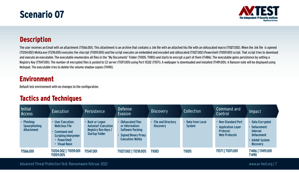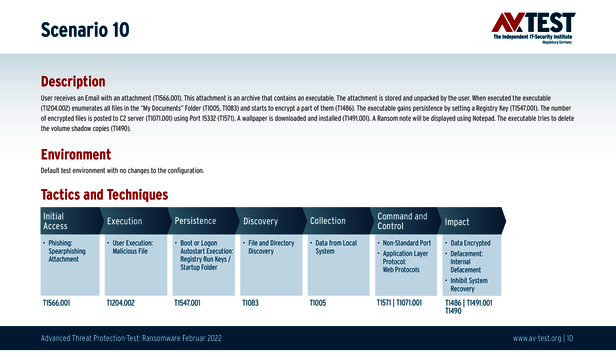 Alle Produkte müssen in 10 realen Szenarien unter Windows 10 gegen Ransomware bestehen. Dabei kommen zum Beispiel Dateien mit versteckter Malware in Archiven, Powerpoint-Dateien mit Scripten oder HTML-Dateien mit gefährlichen Inhalten zum Einsatz. Die 10 Grafiken zu den „Testszenarien“ listen die Art des Angriffs und jeden Schritt dazu auf. Dabei gibt das Labor sogar die Definitionen in MITRE ATT&CK Technikcodes an. Die genauen technischen Schritte eines Advanced Threat Protection-Tests erklärt das Labor für Interessierte auch in dem bereits erschienen Artikel Neue Abwehrkräfte: EPPs und EDRs im Test gegen APT- und Ransomware-Attacken.