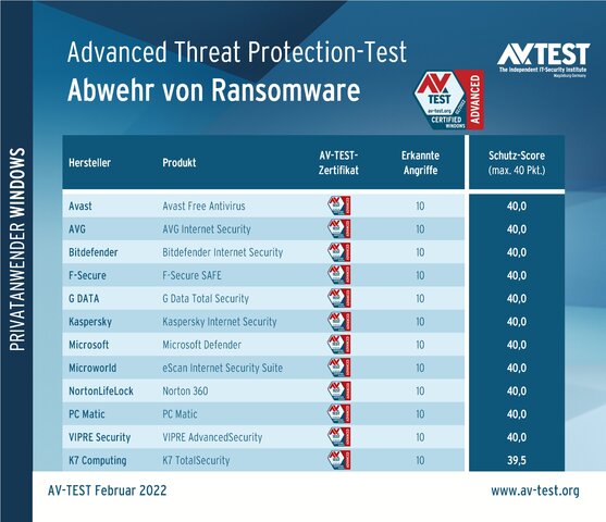 Die Advanced Threat Protection-Tests liefern eine gewichtige Erkenntnis für Hersteller und Nutzer, wie sicher ein Produkt in realen Szenarien gegen Ransomware schützt. An dem Test nehmen 12 Endanwender-Produkte und 14 Schutzlösungen für Unternehmen teil. Die Hersteller der Endanwender-Produkte sind: Avast, AVG, Bitdefender, F-Secure, G DATA, K7 Computing, Kaspersky, Microsoft, Microworld, NortonLifeLock, PC Matic und VIPRE Security.