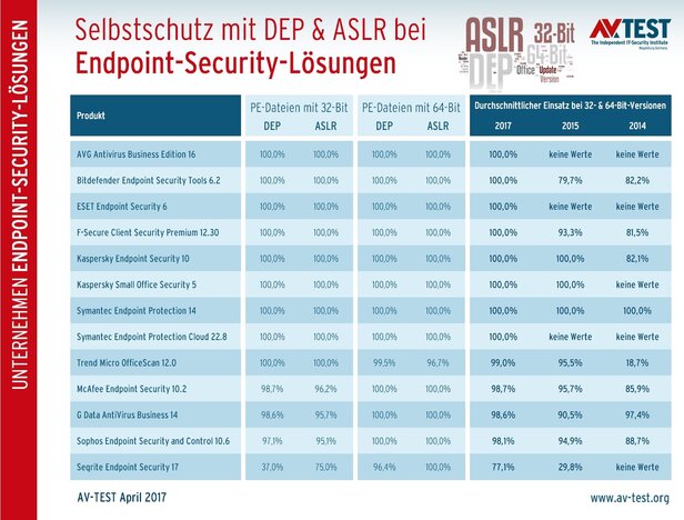 Bereits im November 2014 saß bei einigen Herstellern der Schock tief: zu dieser Zeit wurden die ersten Ergebnisse zum Selbstschutz mit ASLR & DEP bei Antiviren-Software veröffentlicht. Damals sahen für einige Hersteller die Ergebnisse nicht gut aus. Dabei wurde nur geprüft, ob die frei verfügbaren Programmiertechniken ASLR und DEP zum Schutz von User-Mode-PE-Dateien (Portable Executable) für 32- und 64-Bit genutzt werden. Diese Technik ist für Hersteller einfach, kostengünstig und ohne Einfluss auf die Leistung der Pakete zu nutzen. In dem Artikel vom Oktober 2015 ist die ASLR-DEP-Technik genau erklärt. 2014 setzten nur 2 Hersteller die Technik zu 100 Prozent ein. Der Tiefpunkt lag damals bei unter 20 Prozent.