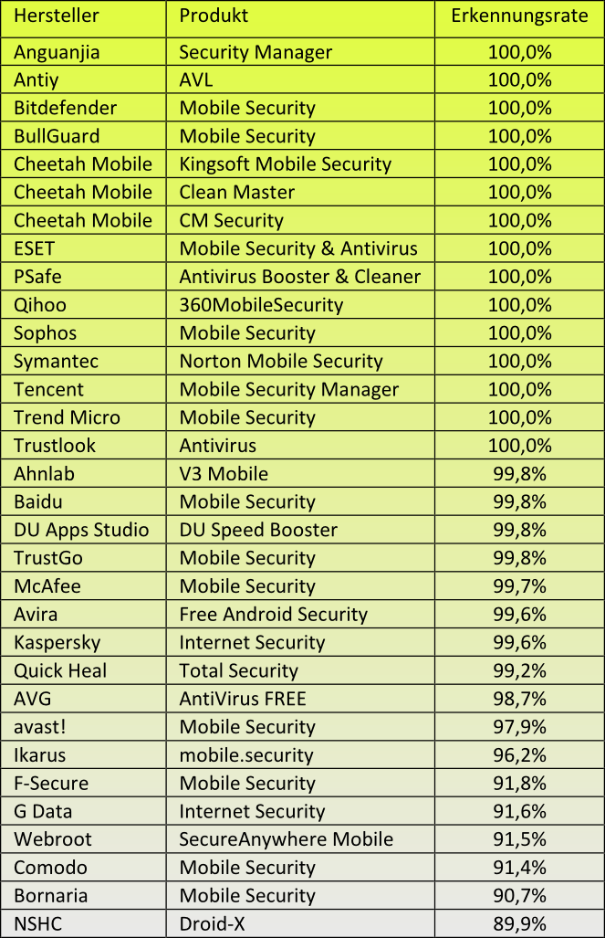 Gleich 13 Apps teilen sich den ersten Rang und unterscheiden sich fast nur durch ihre Extras. Einige davon sind auch kostenlos, wie die von Antiy, Cheetah Mobile, PSafe, Qihoo, Sophos, Tencent oder Trustlook.