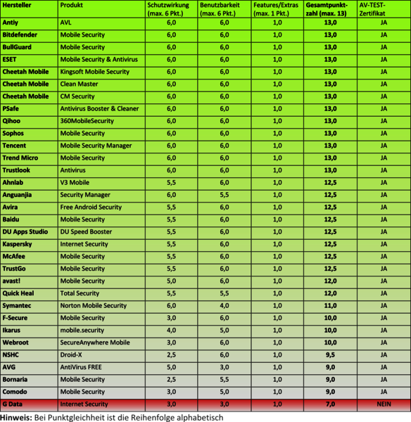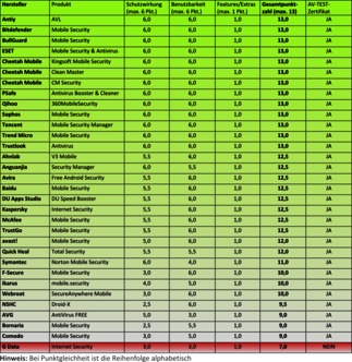 Gleich 13 Apps haben sich mit je 13 Punkten an die Spitze der Tabelle gesetzt. Sie kommen von Antiy, Bitdefender, BullGuard, Cheetah Mobile (3 Produkte), ESET, PSafe, Qihoo, Sophos, Tencent, Trend Micro und Trustlook. Die meisten Apps sind komplett kostenlos zu nutzen. Einige wenige Apps bieten – nach einer kostenlosen Testphase – besondere Premiumfunktionen nur noch gegen Aufpreis. Die Schutzfunktion wird aber auch nach einer Testphase nie abgeschaltet.