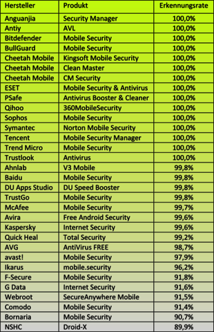 Ausnahmslos alle Schädlinge wurden im Test sogar von 15 Apps erkannt und abgewehrt. Darunter sind neben den 13 Apps mit der Maximalpunktzahl auch noch die Systemwächter von Anguanjia und Symantec. Wer also nur auf die Schutzwirkung Wert legt, hat somit noch eine größere Auswahl bei den mobilen Beschützern.