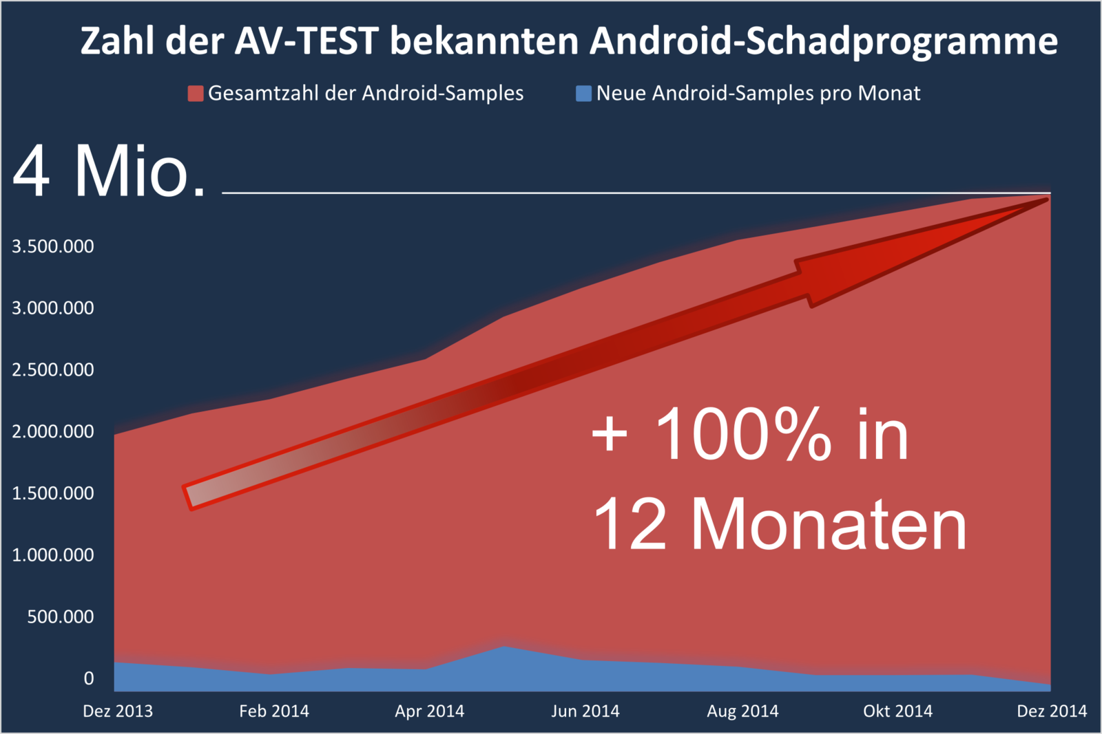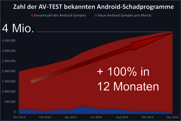 AV-TEST zählt bereits 4 Millionen verseuchte Apps für Android – das sind doppelt so viele wie noch ein Jahr zuvor (Stand AV-TEST, Dezember 2014).