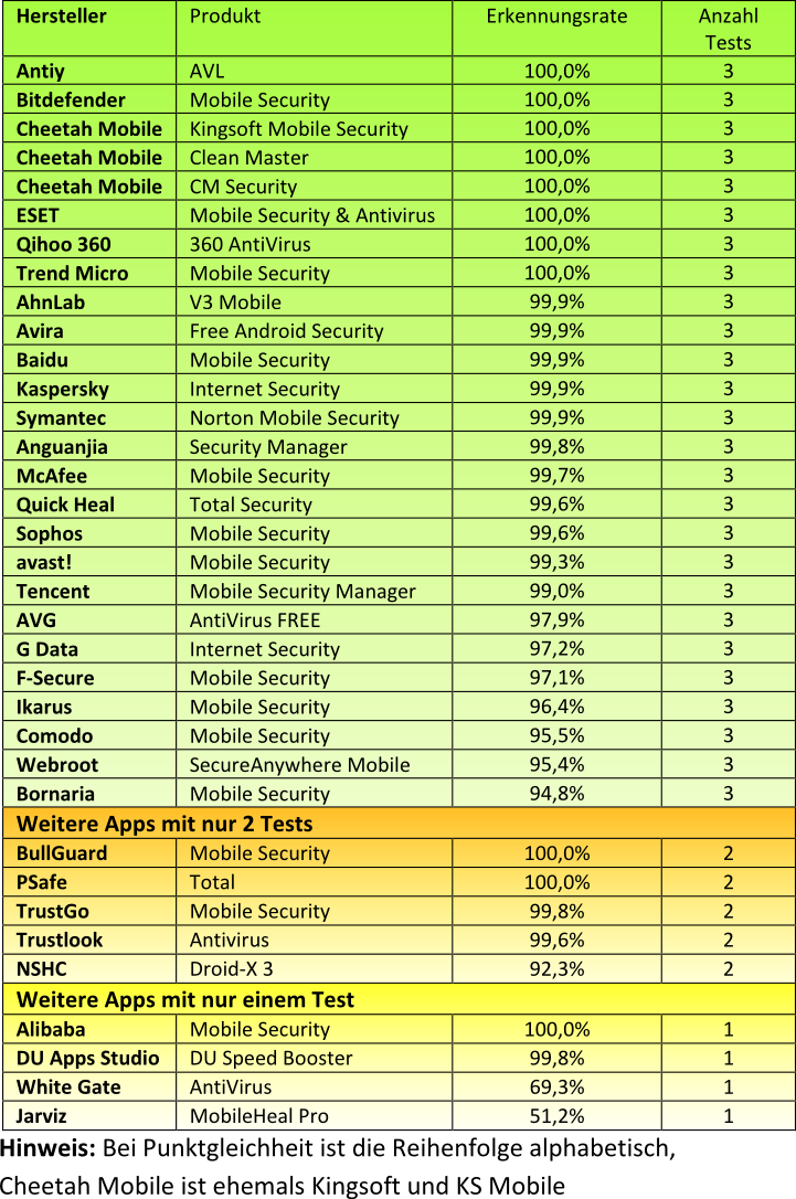 Gleich 7 der 26 Apps, die an allen Testrunden teilgenommen haben, erreichten die Bestmarke von 13 Punkten. Sie kommen von Antiy, Bitdefender, Cheetah Mobile (drei Versionen), ESET und Qihoo. Weitere 10 Apps folgen mit ebenfalls sehr guten Punktzahlen zwischen 12,3 und 12,8 Punkten.