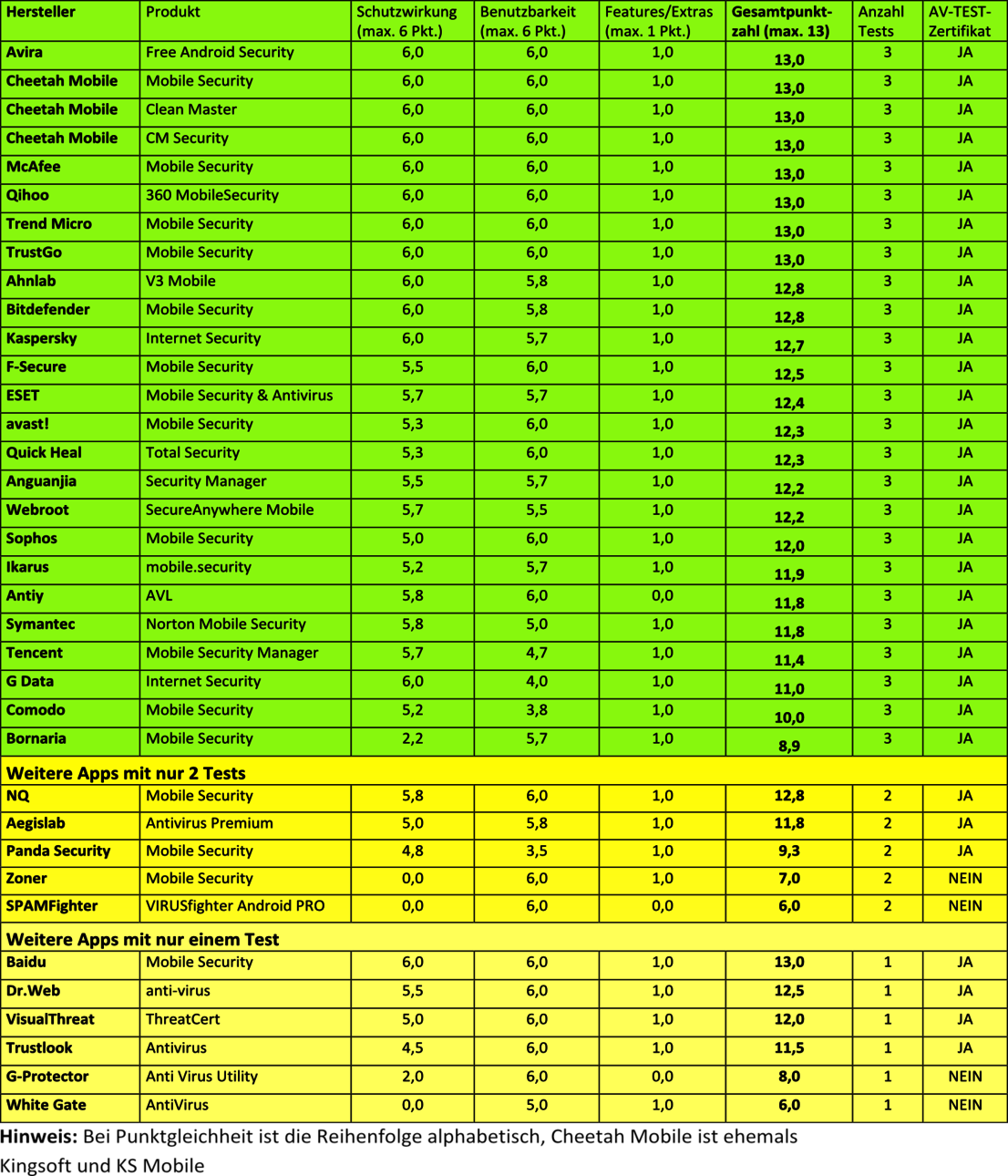 Gegen alle diese Angriffe gibt es ein Mittel: eine gute Security-App für Android. Insgesamt 8 Apps haben das Maximum von 13 Punkten erreicht: Avira, Cheetah Mobile (alle 3 Versionen), McAfee, Qihoo, Trend Micro und TrustGo.