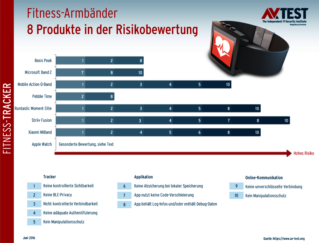 Auch in der diesjährigen Testrunde bergen einige Fitnessbändern ein hohes Sicherheitsrisiko. Die Apple Watch fehlt in der Aufzählung, da sie wegen der Testunterschiede bei Android gesondert bewertet wurde.