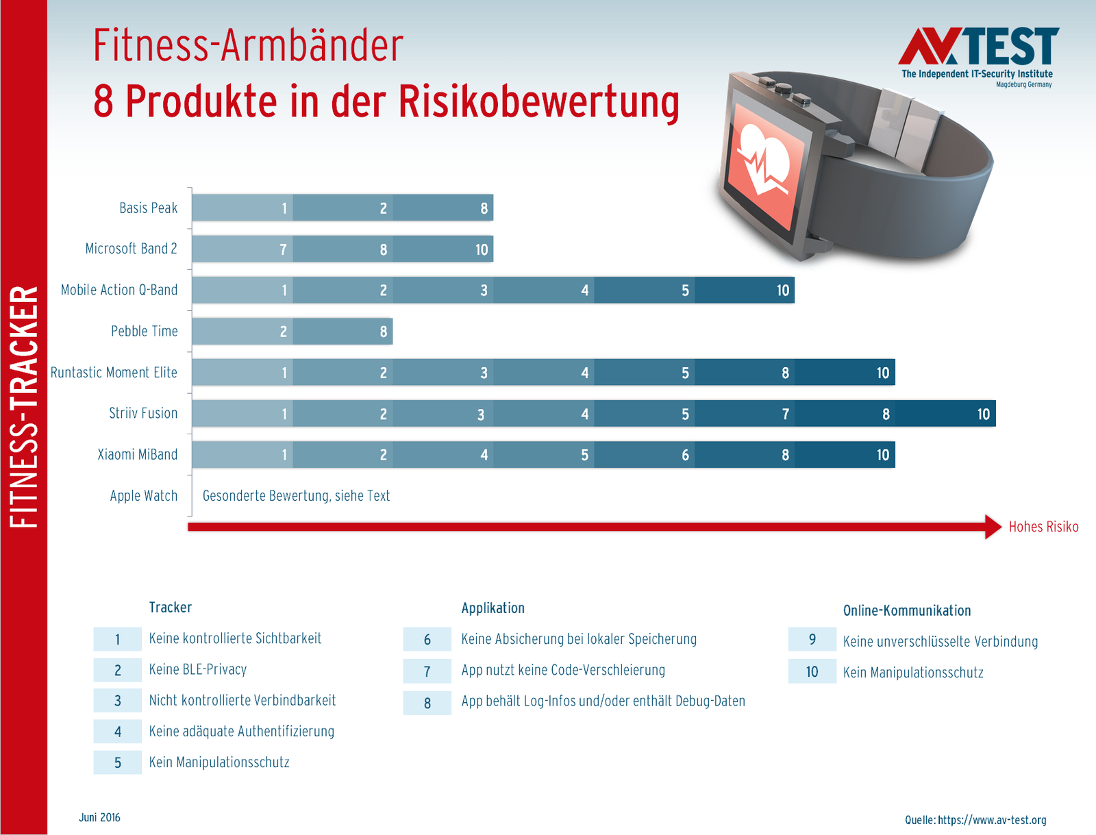 Die Tester haben jedes Fitness-Armband insgesamt 10 Prüfpunkten unterzogen, die in drei Bereiche unterteilt sind: Tracker, Applikation und Online-Kommunikation. Die Grafik zur Risikobewertung zeigt, in welchen Bereichen die Testkandidaten Probleme haben und ob die Tester diesen Punkt als Risiko einstufen. Der Begriff Fehler oder Sicherheitsloch wurde hier explizit nicht gewählt, da an den geprüften Stellen nur das erhöhte oder hohe Risiko eines Eindringens gegeben ist, aber nicht explizit eine offene Tür. Die Tester haben auch nicht weiter versucht, einen Risikopunkt zu „knacken". Sie haben nur analysiert, was ein Angreifer weiter an dieser Stelle machen könnte und mit welchen Folgen.