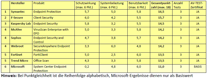 Die Schutzlösung von Symantec führt mit 16,5 von 18 möglichen Punkten das Feld an. Client Security von F-Secure liegt mit 15,7 Punkten knapp dahinter. Der von Microsoft vorgelegte Basiswert lag bei nur 11 Punkten.