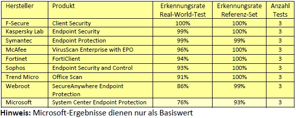 Der aktuelle Dauertest von neun Sicherheitslösungen belegt die Beständigkeit der verfügbaren Produkte von Fortinet, F-Secure, Kaspersky Lab, McAfee, Sophos, Symantec, Trend Micro und Webroot. Zum Vergleich hat AV-TEST Microsofts Endpoint-Security-Suite mitgetestet, aber nicht bewertet. Denn die Suite ist kein eigenes Produkt, sondern Bestandteil des Microsoft System Centers 2012. Besitzer einer Lizenz der Management Suite haben automatisch das Modul System Center Endpoint Protection 2012 mit dabei. Ohne die Management Suite würde das Endpoint-Protection-Paket nicht funktionieren.