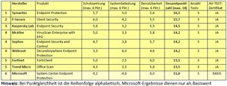 Insgesamt lagen in der Gesamtwertung alle Lösungen über dem Basiswert der Endpoint-Security-Suite von Microsoft. Damit ist belegt, dass der Einsatz einer externen Schutzlösung anstelle der Microsoft-Lösung die Systemsicherheit deutlich erhöht.