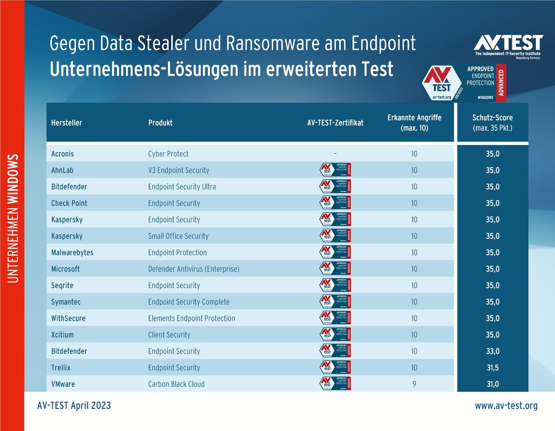 Die größte Gruppe mit 12 Produkten besteht den Test mit den besten Werten und erhält jeweils volle 35 Punkte für den Schutz-Score: Acronis, AhnLab, Bitdefender Version Ultra, Check Point, Kaspersky (beide Versionen), Malwarebytes, Microsoft, Seqrite, Symantec, WithSecure und Xcitium.