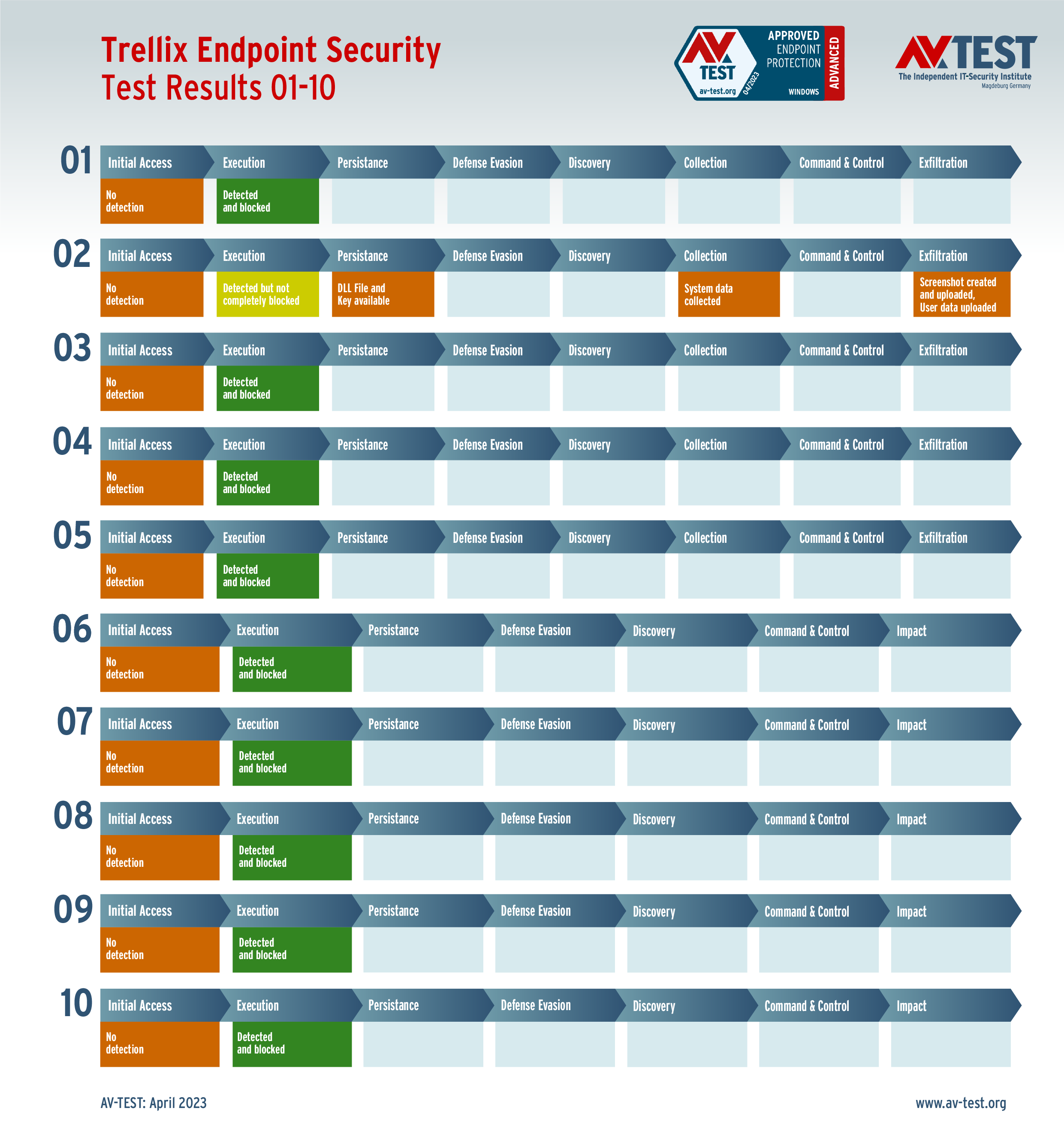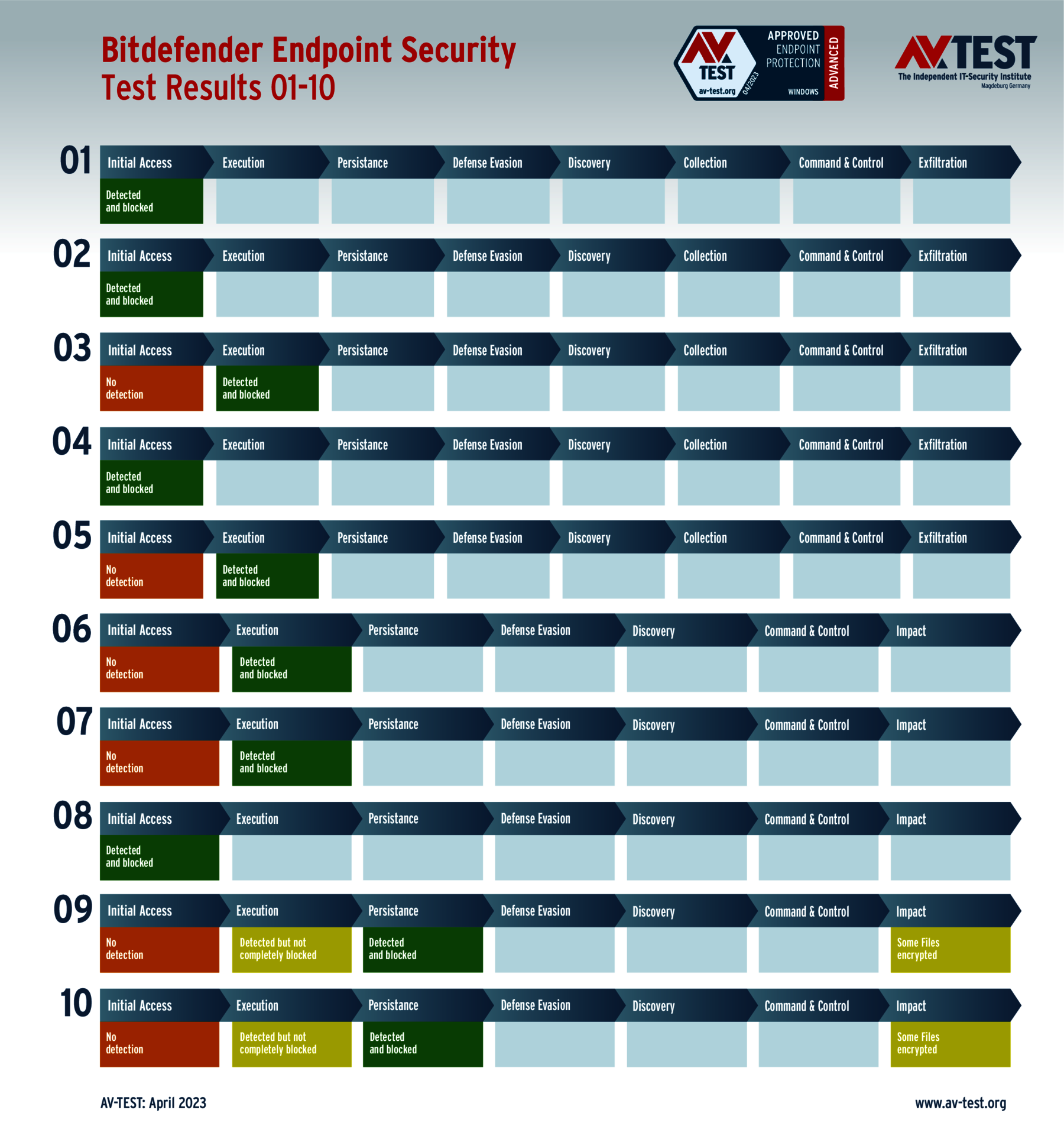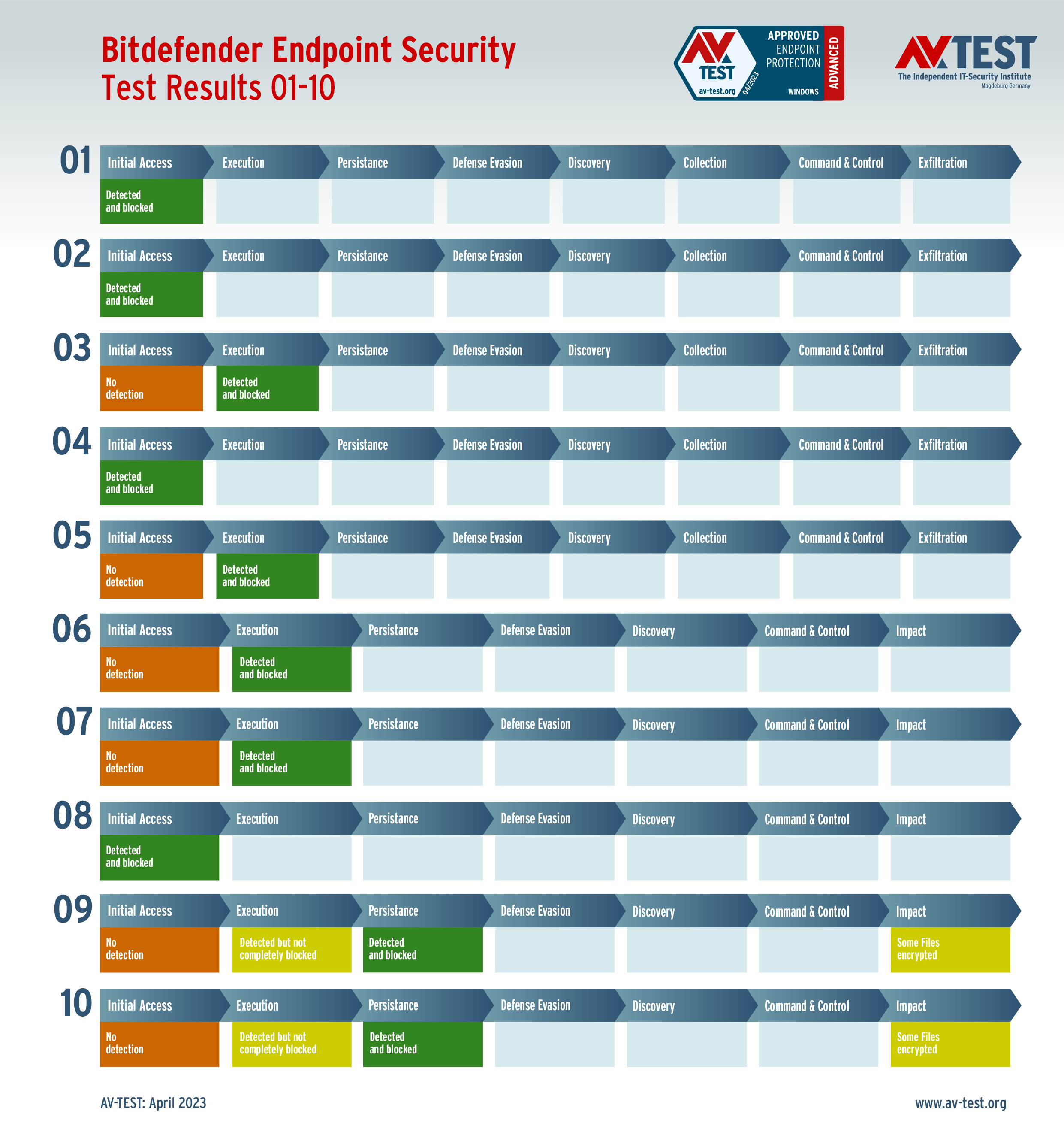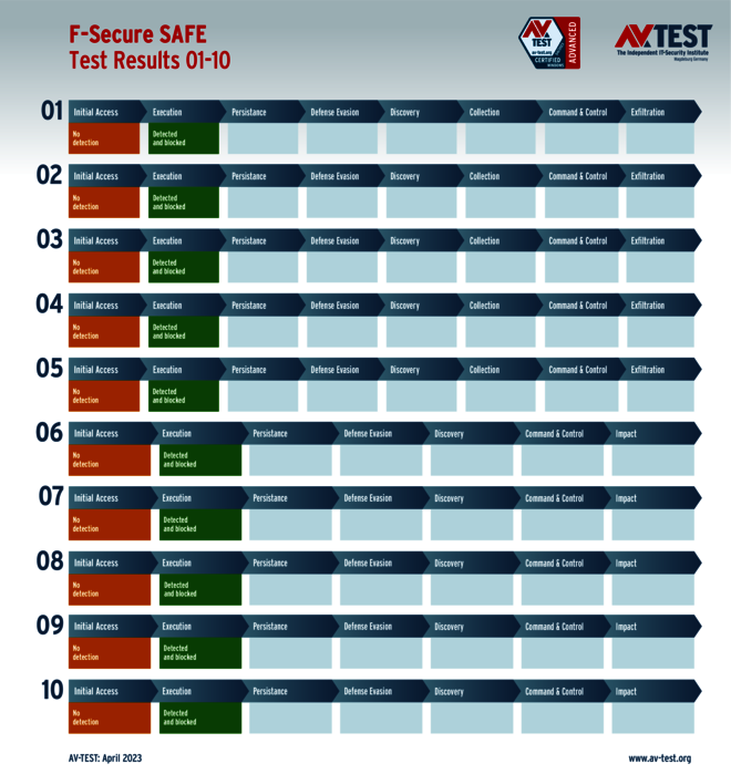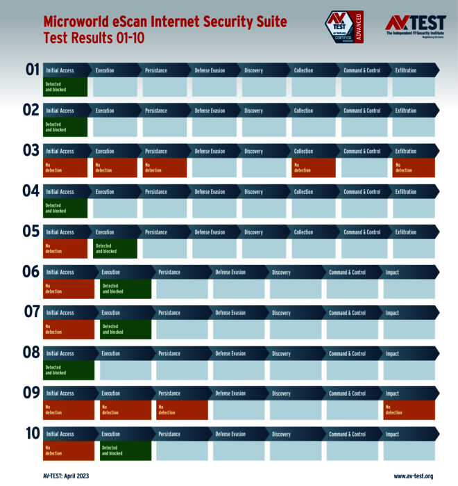 In diesem Test hat das Labor 5 Exemplare von Data Stealern und 5 Exemplare von Ransomware per Spear-Phishing-E-Mail an die Test-Systeme geschickt. Danach landeten sie zuerst auf dem System und wurden im nächsten Schritt aktiv. Bereits bei diesen beiden Schritten erkennen viele Produkte die Gefahr und wehren den Angriff ab. Ist das nicht der Fall, sammeln die Data Stealer Informationen zu den Daten, um sie danach an einen C2-Server zu „exfiltrieren“. Die Ransomware sammelt zwar auch Informationen, aber mit dem Ziel, eine Dateiliste an den C2-Server zu schicken, während die Verschlüsslung der Daten startet. Die 10 Szenario-Grafiken zeigen die Angriffsabläufe. Die Fälle 1 bis 5 beschreiben den Angriff von Data Stealern und die Fälle 6 bis 10 die Angriffe von Ransomware.