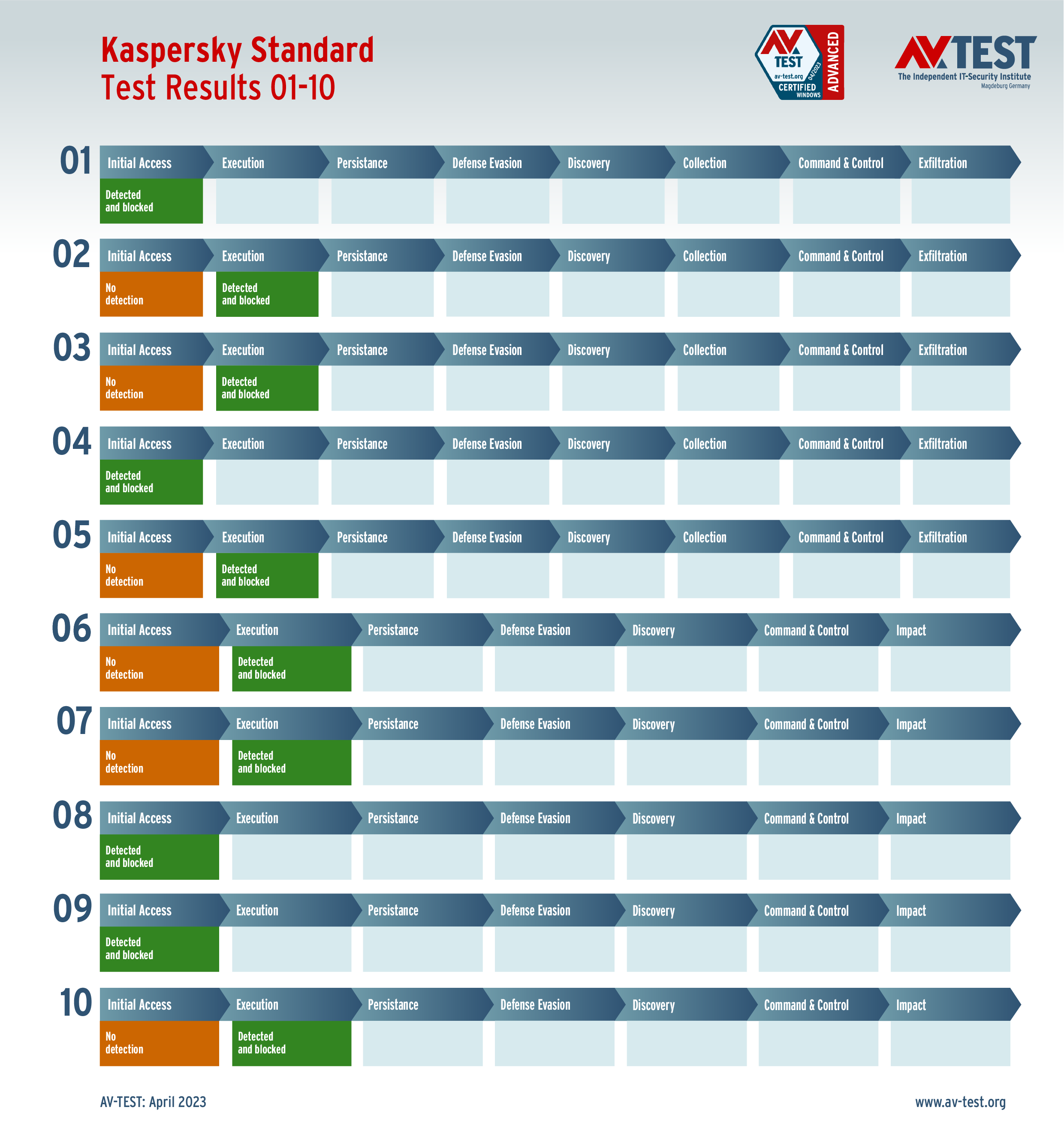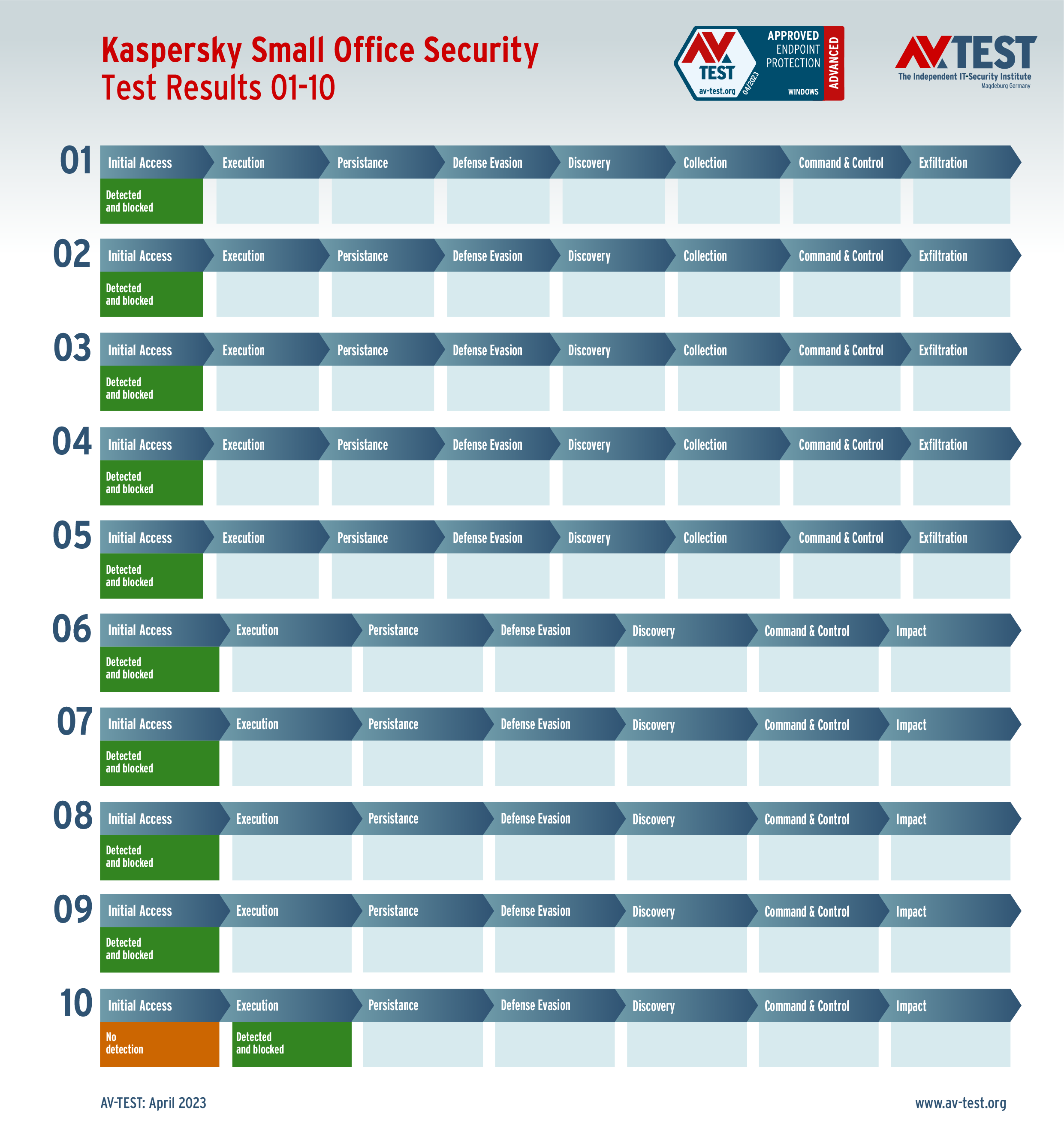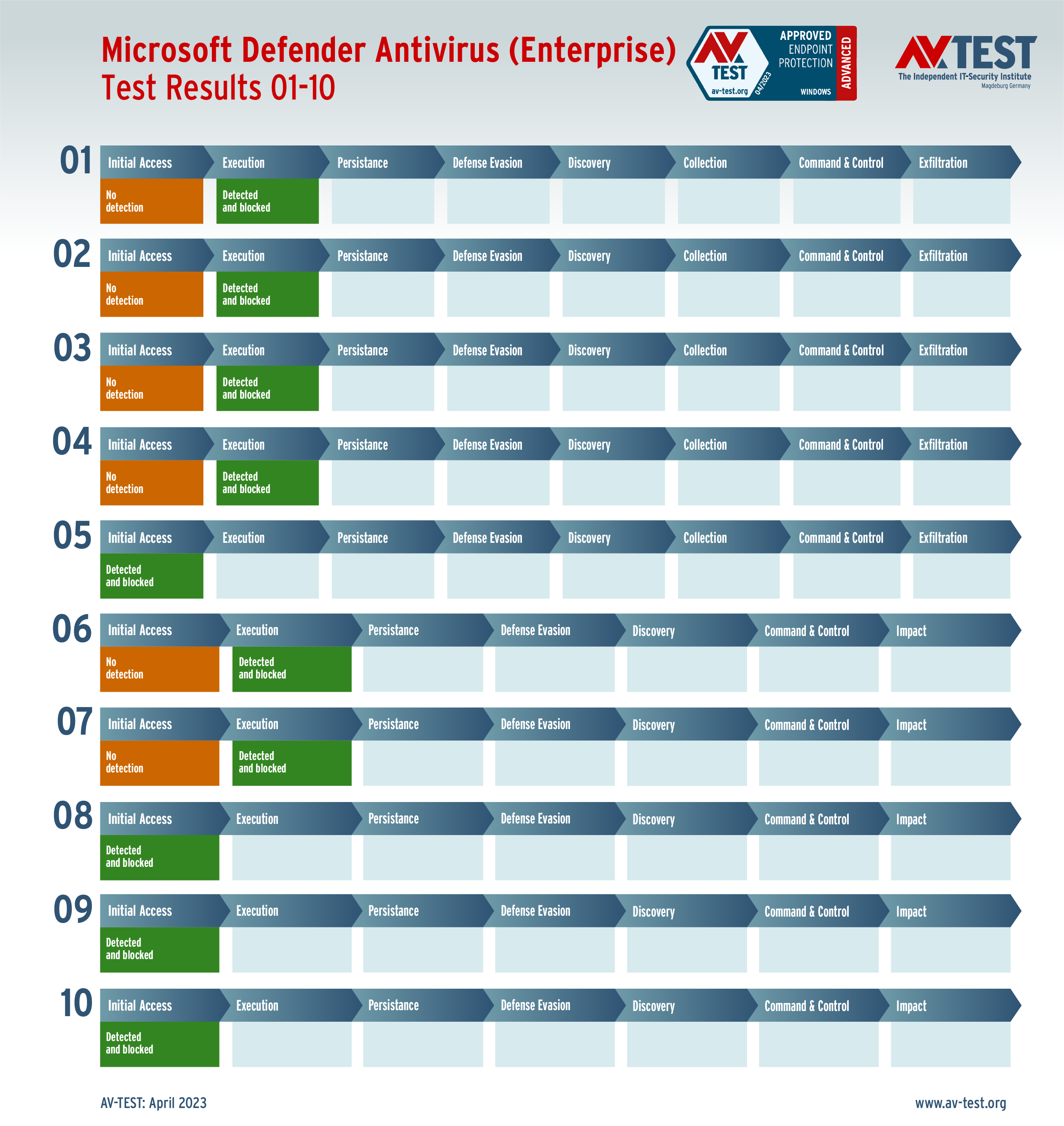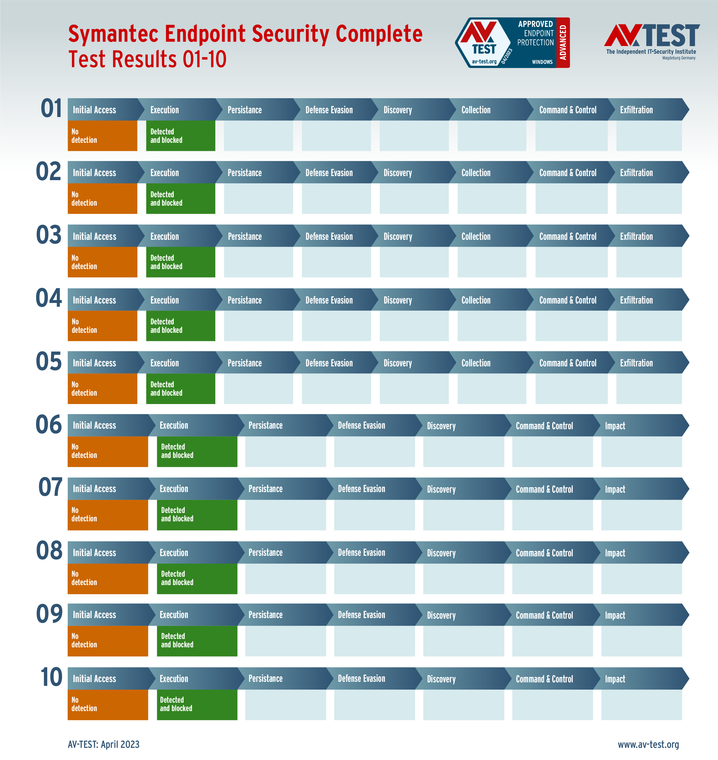 In diesem Test hat das Labor 5 Exemplare von Data Stealern und 5 Exemplare von Ransomware per Spear-Phishing-E-Mail an die Test-Systeme geschickt. Danach landeten sie zuerst auf dem System und wurden im nächsten Schritt aktiv. Bereits bei diesen beiden Schritten erkennen viele Produkte die Gefahr und wehren den Angriff ab. Ist das nicht der Fall, sammeln die Data Stealer Informationen zu den Daten, um sie danach an einen C2-Server zu „exfiltrieren“. Die Ransomware sammelt zwar auch Informationen, aber mit dem Ziel, eine Dateiliste an den C2-Server zu schicken, während die Verschlüsslung der Daten startet. Die 10 Szenario-Grafiken zeigen die Angriffsabläufe. Die Fälle 1 bis 5 beschreiben den Angriff von Data Stealern und die Fälle 6 bis 10 die Angriffe von Ransomware.