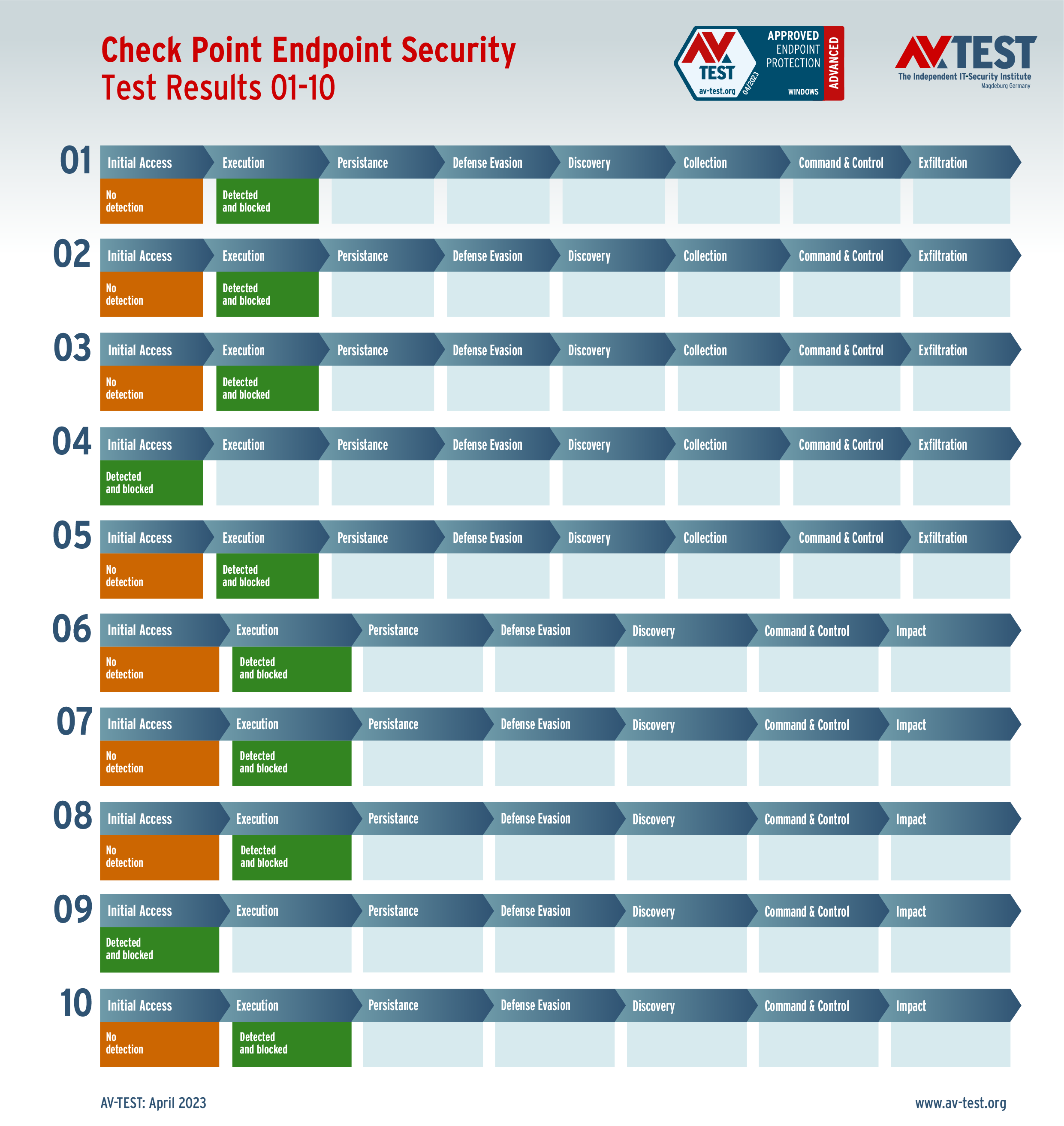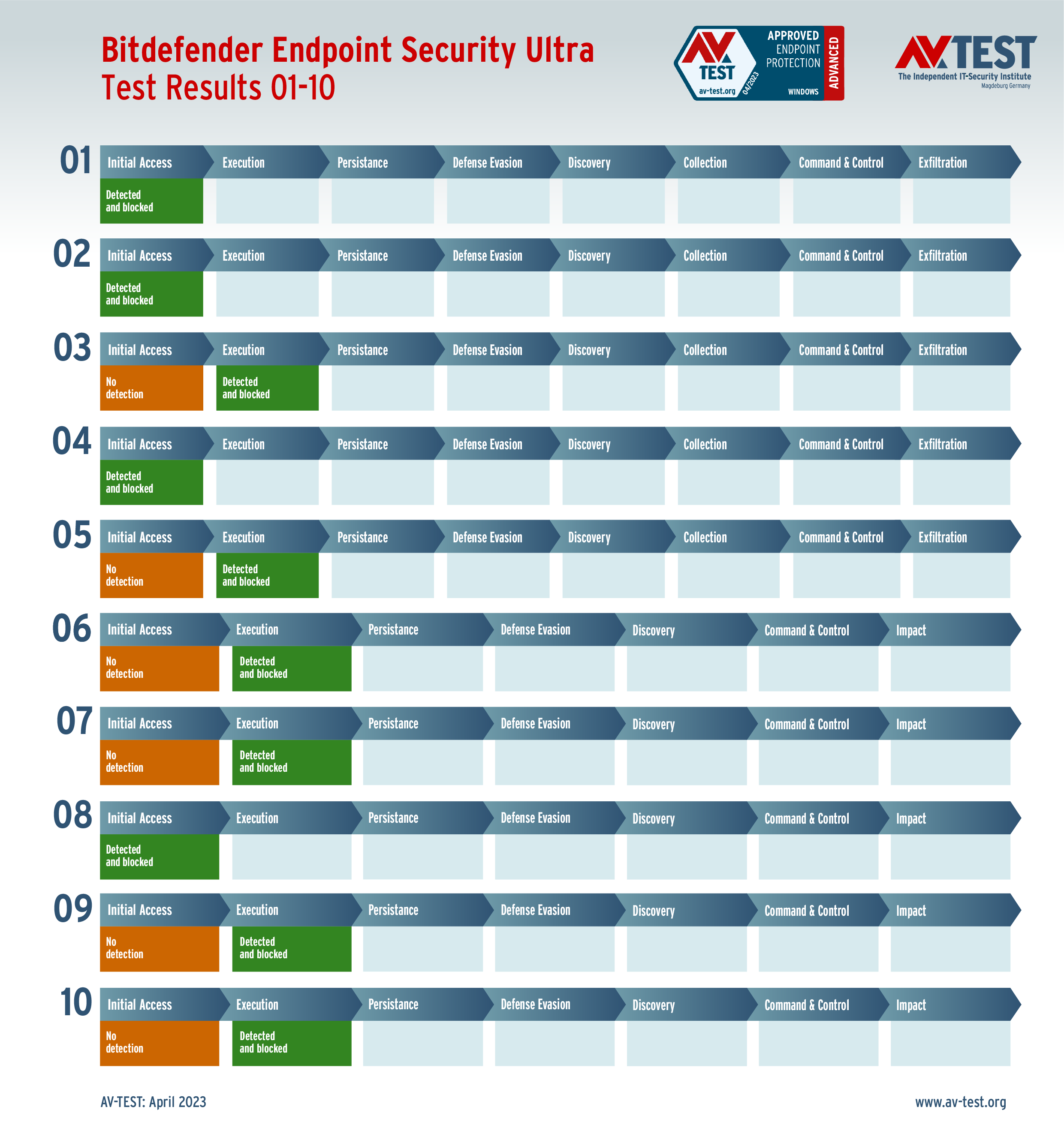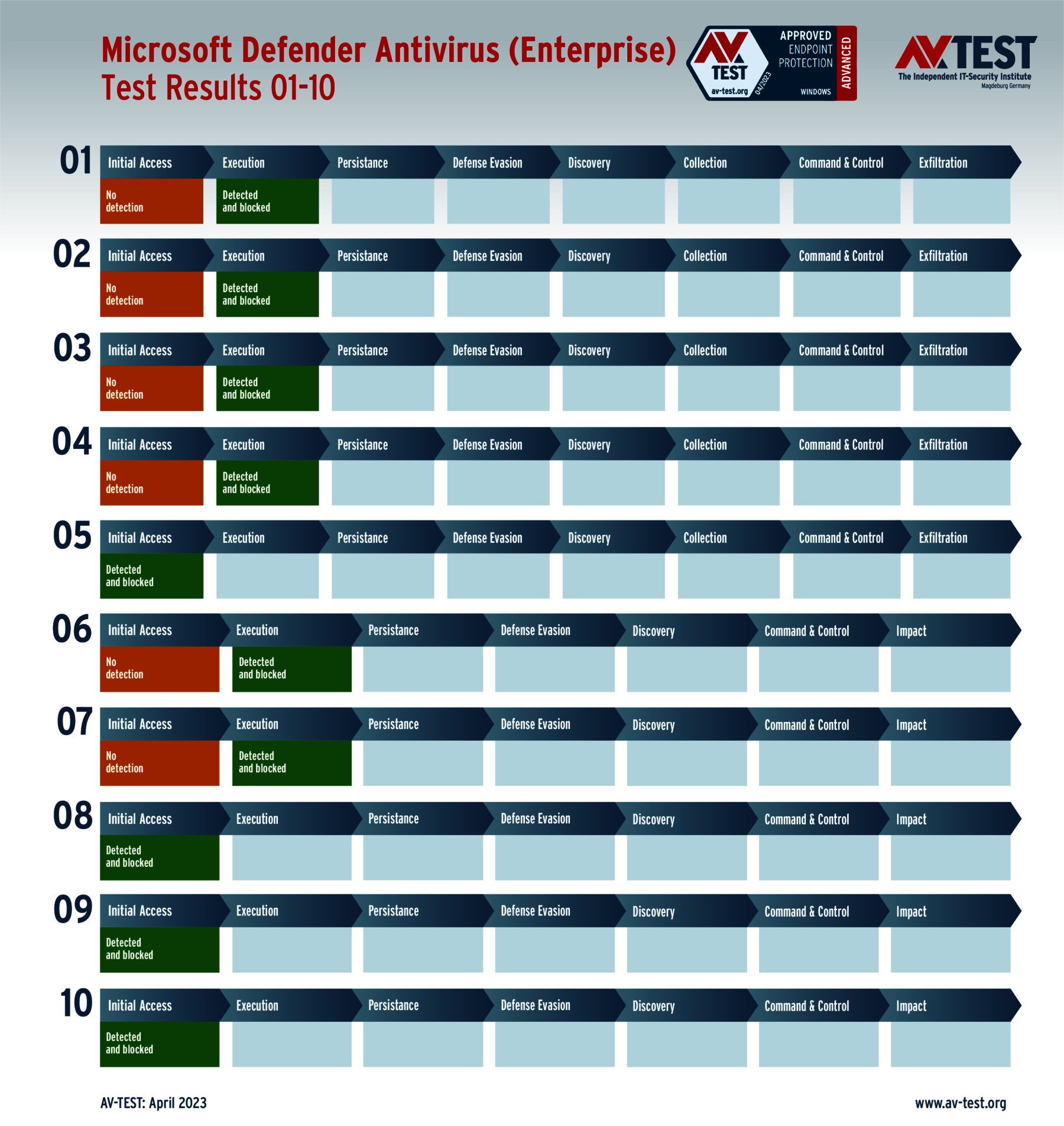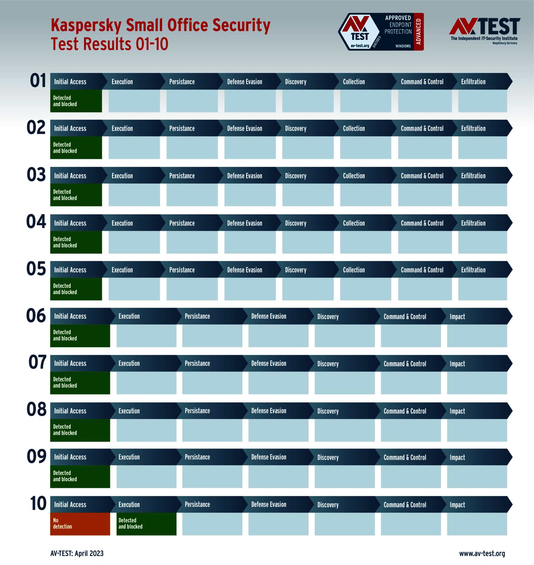 In diesem Test hat das Labor 5 Exemplare von Data Stealern und 5 Exemplare von Ransomware per Spear-Phishing-E-Mail an die Test-Systeme geschickt. Danach landeten sie zuerst auf dem System und wurden im nächsten Schritt aktiv. Bereits bei diesen beiden Schritten erkennen viele Produkte die Gefahr und wehren den Angriff ab. Ist das nicht der Fall, sammeln die Data Stealer Informationen zu den Daten, um sie danach an einen C2-Server zu „exfiltrieren“. Die Ransomware sammelt zwar auch Informationen, aber mit dem Ziel, eine Dateiliste an den C2-Server zu schicken, während die Verschlüsslung der Daten startet. Die 10 Szenario-Grafiken zeigen die Angriffsabläufe. Die Fälle 1 bis 5 beschreiben den Angriff von Data Stealern und die Fälle 6 bis 10 die Angriffe von Ransomware.