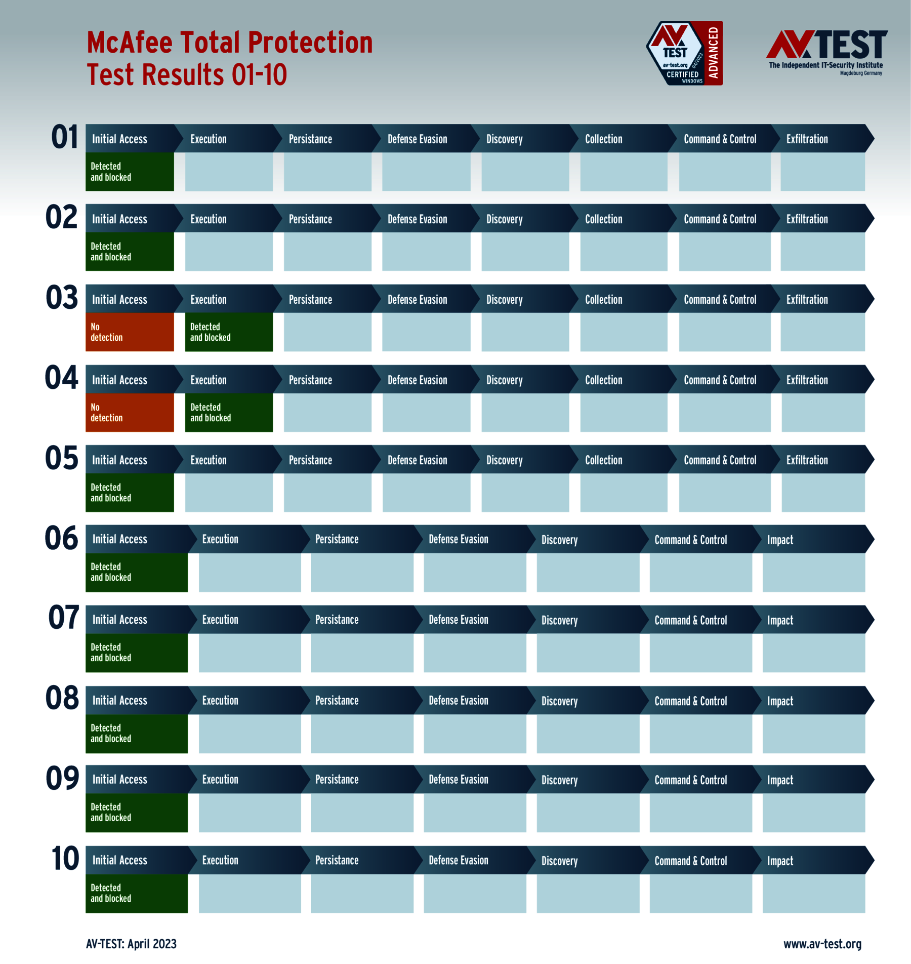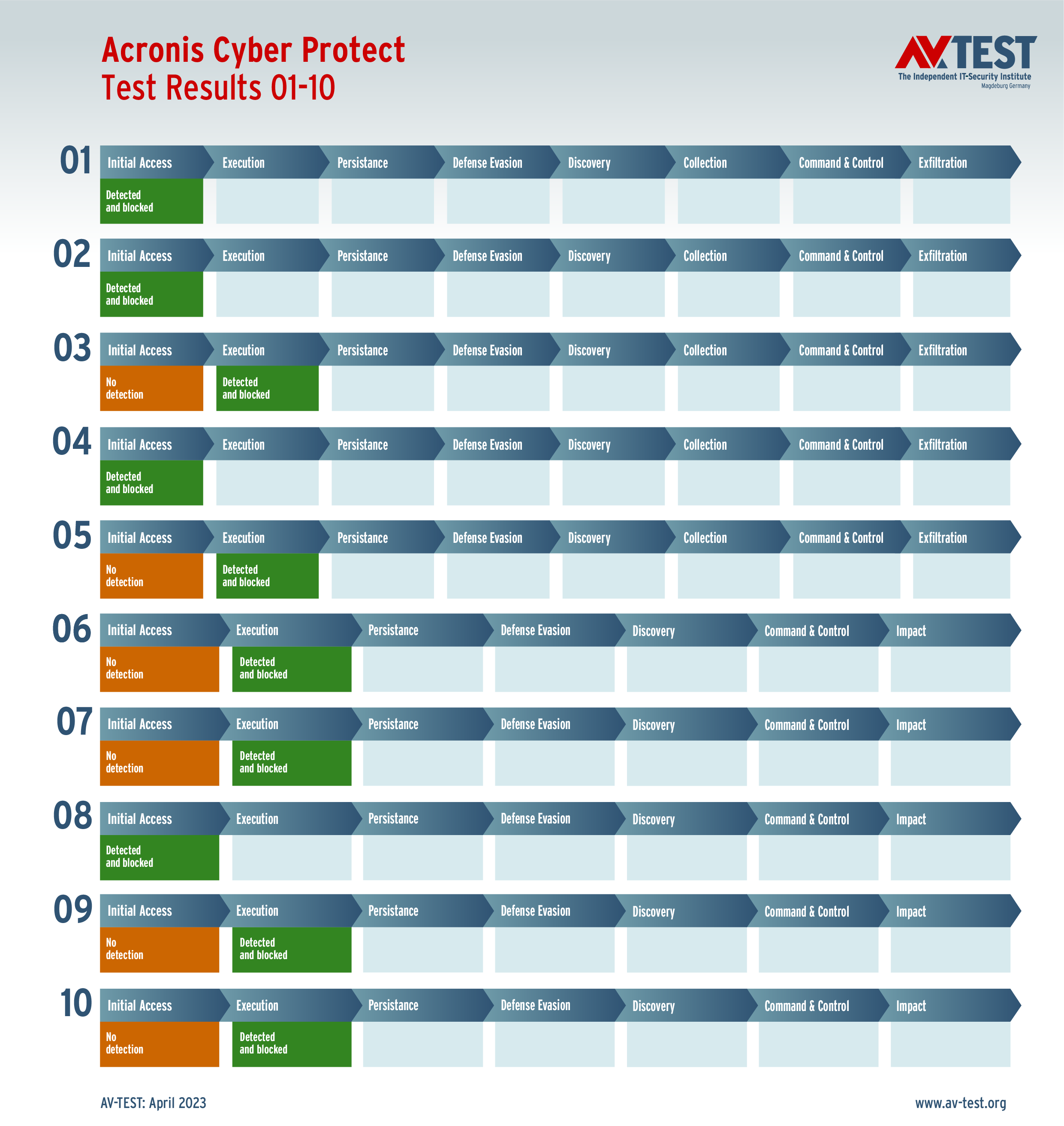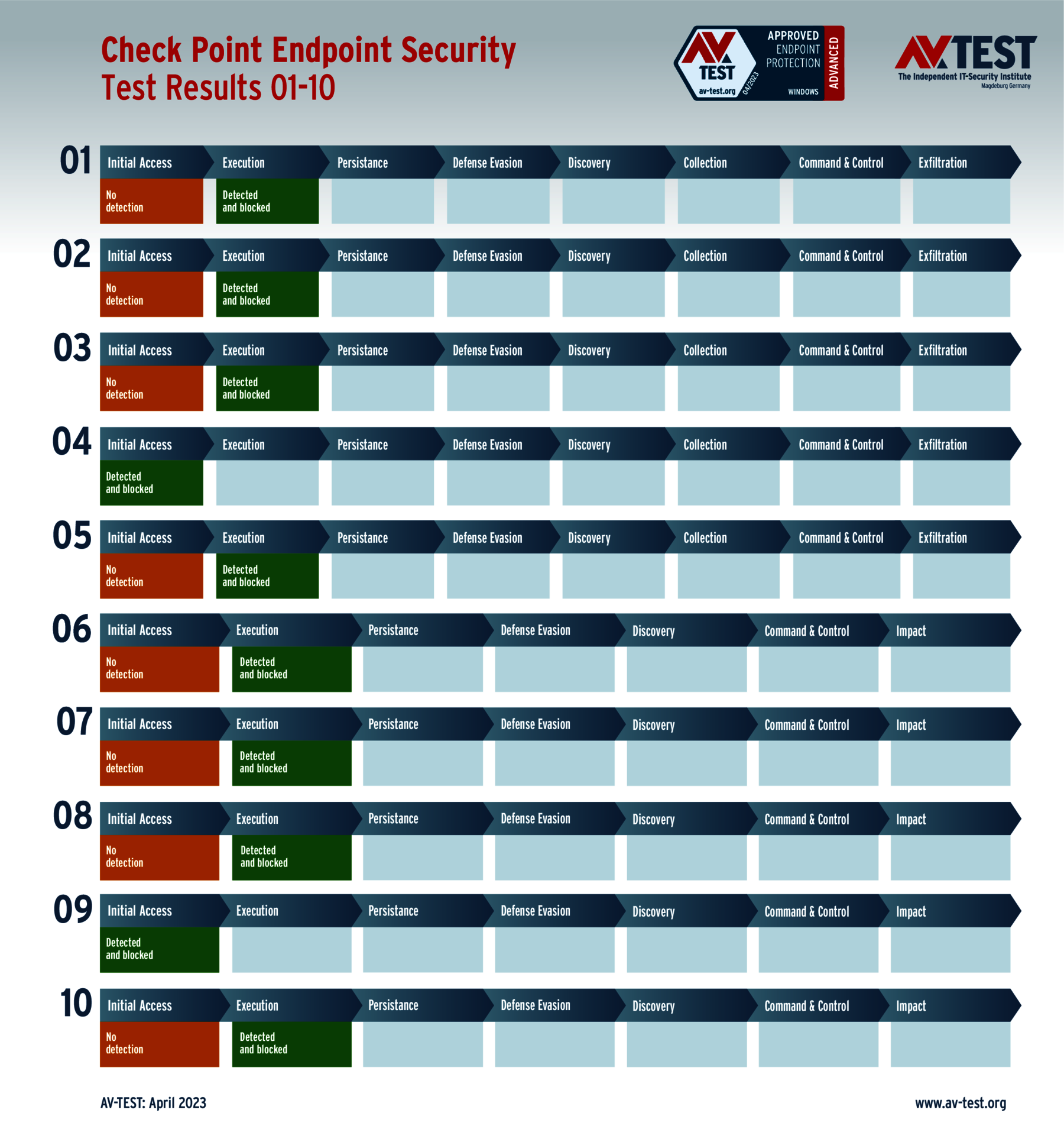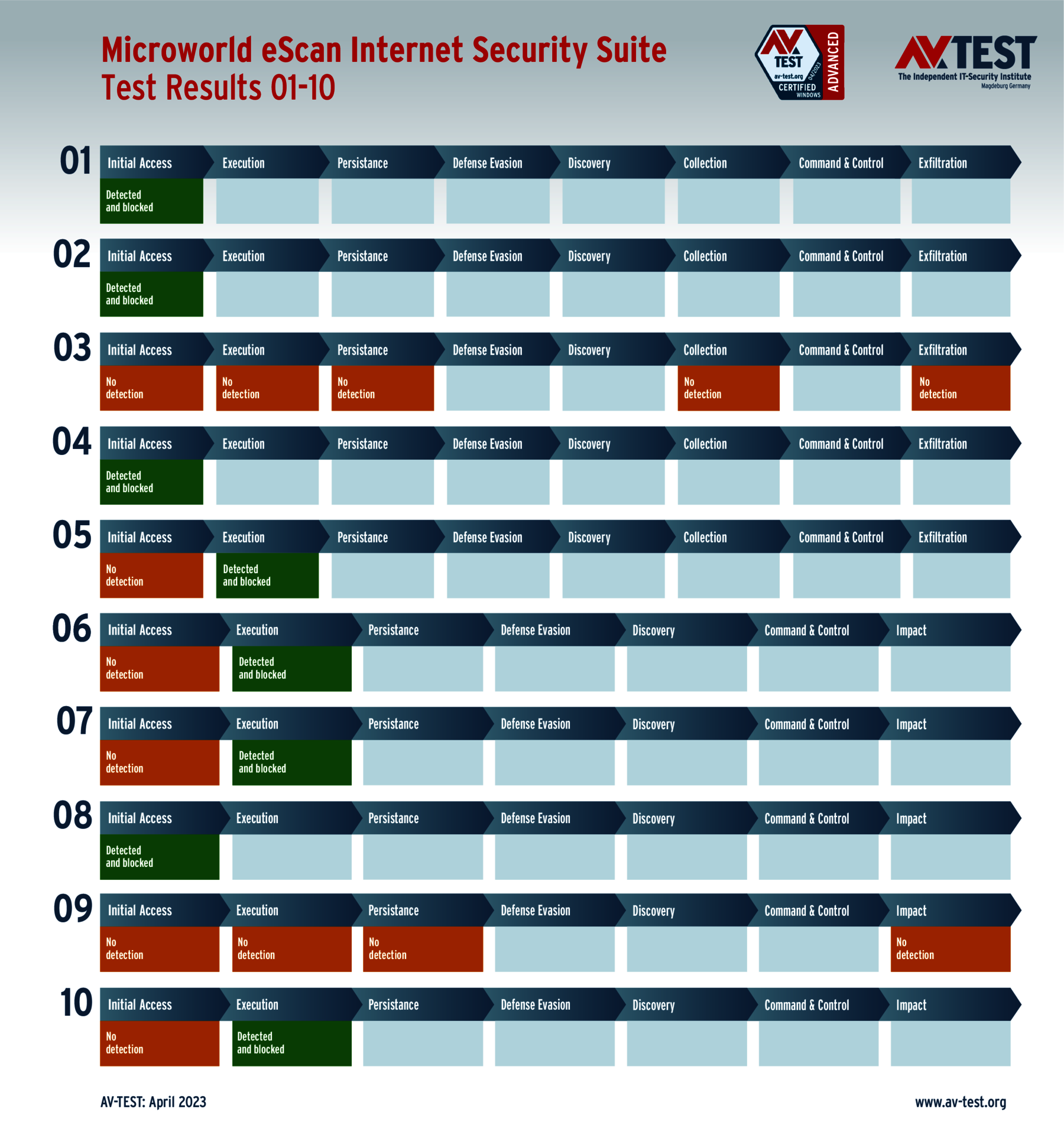 In diesem Test hat das Labor 5 Exemplare von Data Stealern und 5 Exemplare von Ransomware per Spear-Phishing-E-Mail an die Test-Systeme geschickt. Danach landeten sie zuerst auf dem System und wurden im nächsten Schritt aktiv. Bereits bei diesen beiden Schritten erkennen viele Produkte die Gefahr und wehren den Angriff ab. Ist das nicht der Fall, sammeln die Data Stealer Informationen zu den Daten, um sie danach an einen C2-Server zu „exfiltrieren“. Die Ransomware sammelt zwar auch Informationen, aber mit dem Ziel, eine Dateiliste an den C2-Server zu schicken, während die Verschlüsslung der Daten startet. Die 10 Szenario-Grafiken zeigen die Angriffsabläufe. Die Fälle 1 bis 5 beschreiben den Angriff von Data Stealern und die Fälle 6 bis 10 die Angriffe von Ransomware.