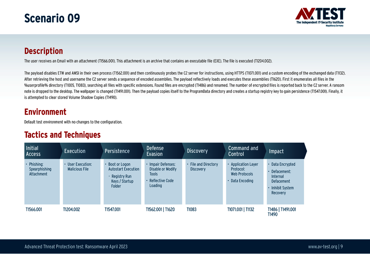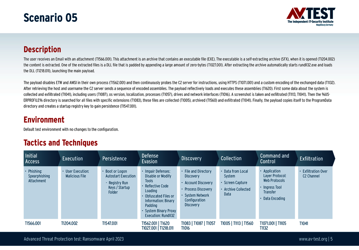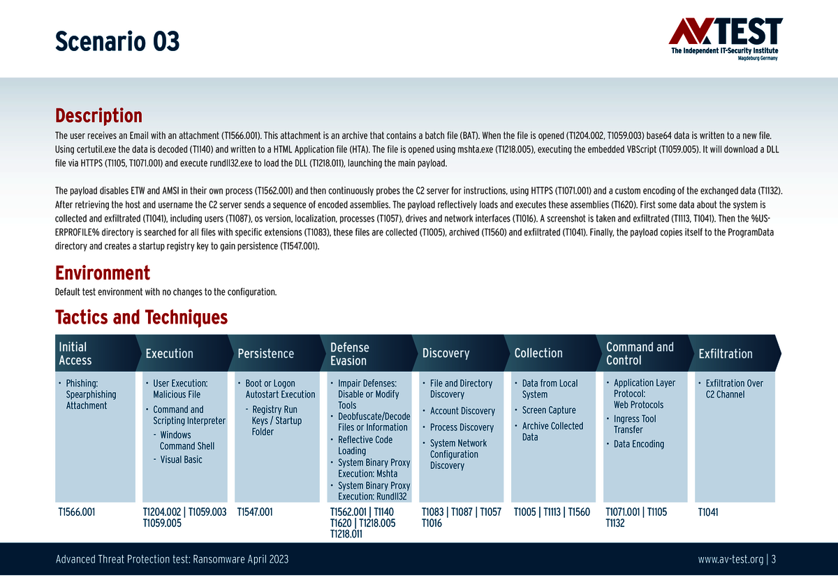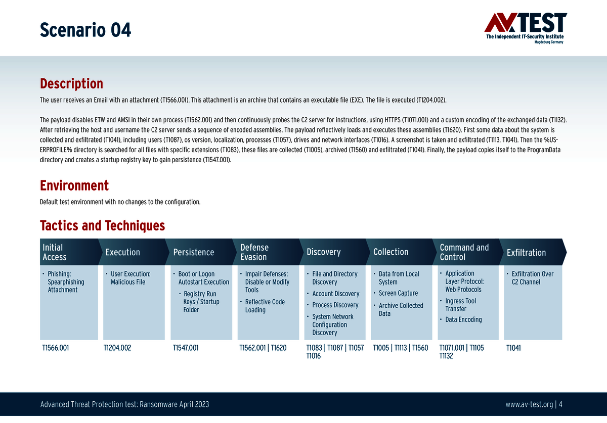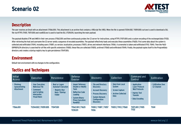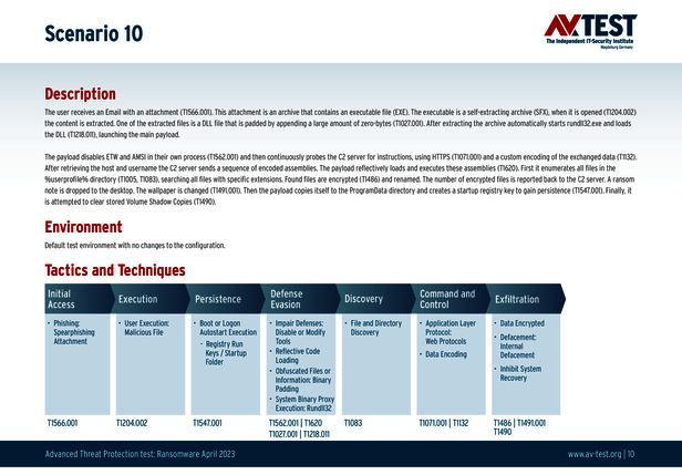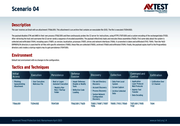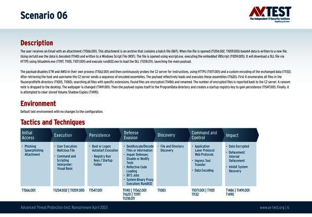 Alle Angriffs-Szenarien sind dokumentiert nach dem Standard der MITRE ATT&CK-Datenbank. Die einzelnen Unterpunkte, z.B. „T1566.001,“ stehen in der MITRE-Datenbank für „Techniques“ unter „Phishing: Spearphishing Attachment“. Jeder Testschritt ist so unter Fachleuten definiert und lässt sich nachvollziehen. Zusätzlich sind alle Angriffstechniken erklärt und wie dabei die Malware zum Zuge kommt.