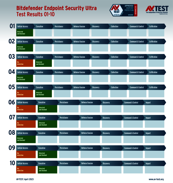 Bitdefender Endpoint Security kann zwar in allen 10 Testszenarien die Angreifer erkennen, aber in 2 Fällen mit Ransomware die Angreifer nicht komplett aufhalten. Es greifen zwar noch einige Gegenaktionen, aber am Ende kommt es in beiden Fällen zu einer teilweisen Verschlüsselung von einzelnen Dateien. Dafür gibt es Punktabzug. Es bleiben somit noch 33 von 35 möglichen Punkten für den Schutz-Score.